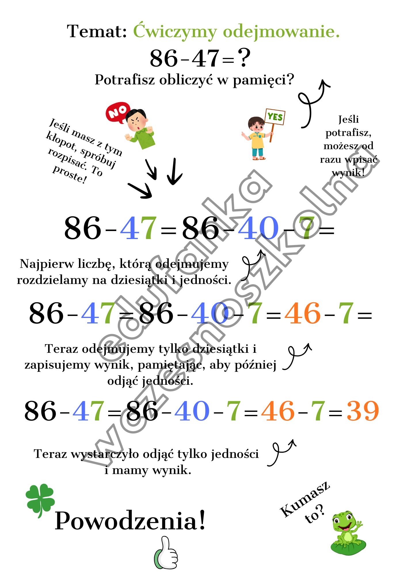 Gotowa wklejka do zeszytu wyjaśniająca w prosty i przejrzysty sposób, jak można rozpisywać działanie wymagające odejmowania liczb dwucyfrowych.