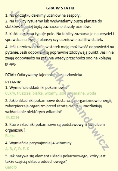 Gra w statki do wykorzystania podczas podsumowania działu: Odkrywamy tajemnice ciała człowieka.