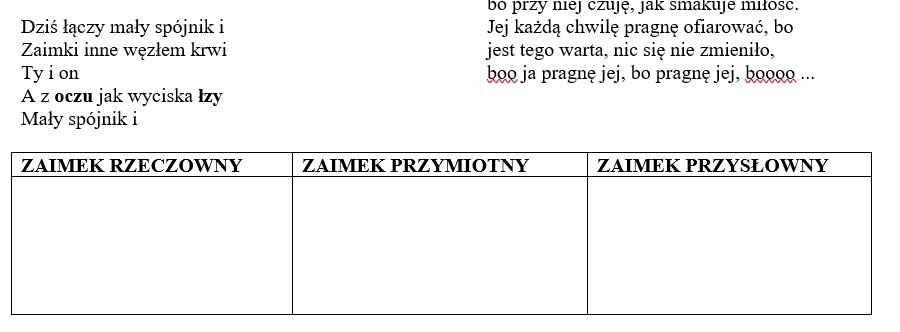 1. Podkreślenie zaimków w tekstach oraz posortowanie ich na zaimki rzeczowne, przymiotne i przysłowne (tabela).