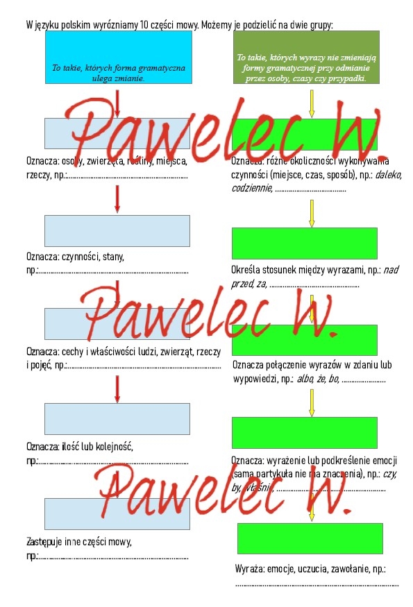 Notatka, w której należy we właściwe miejsca wpisać odmienne i nieodmienne części mowy.