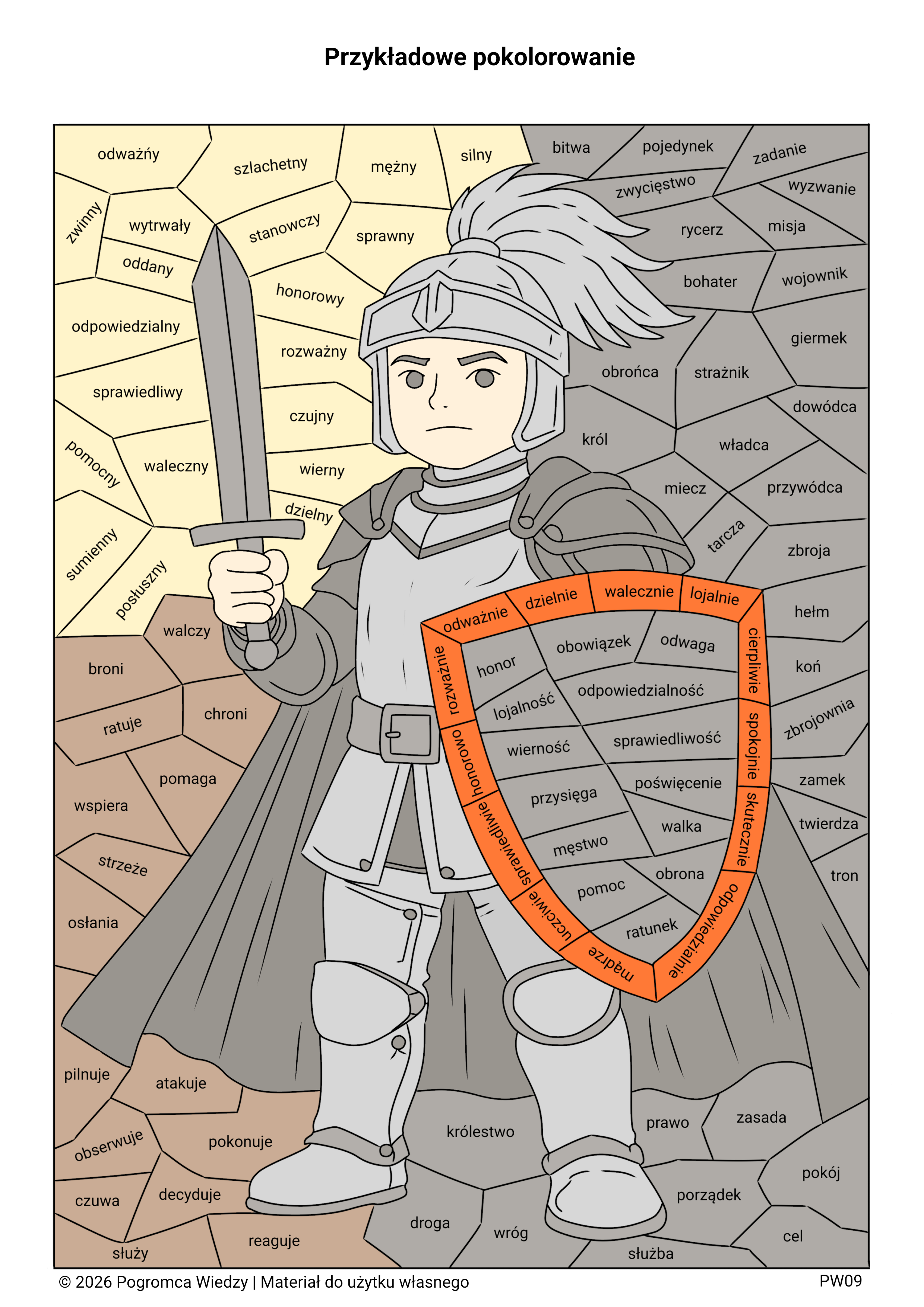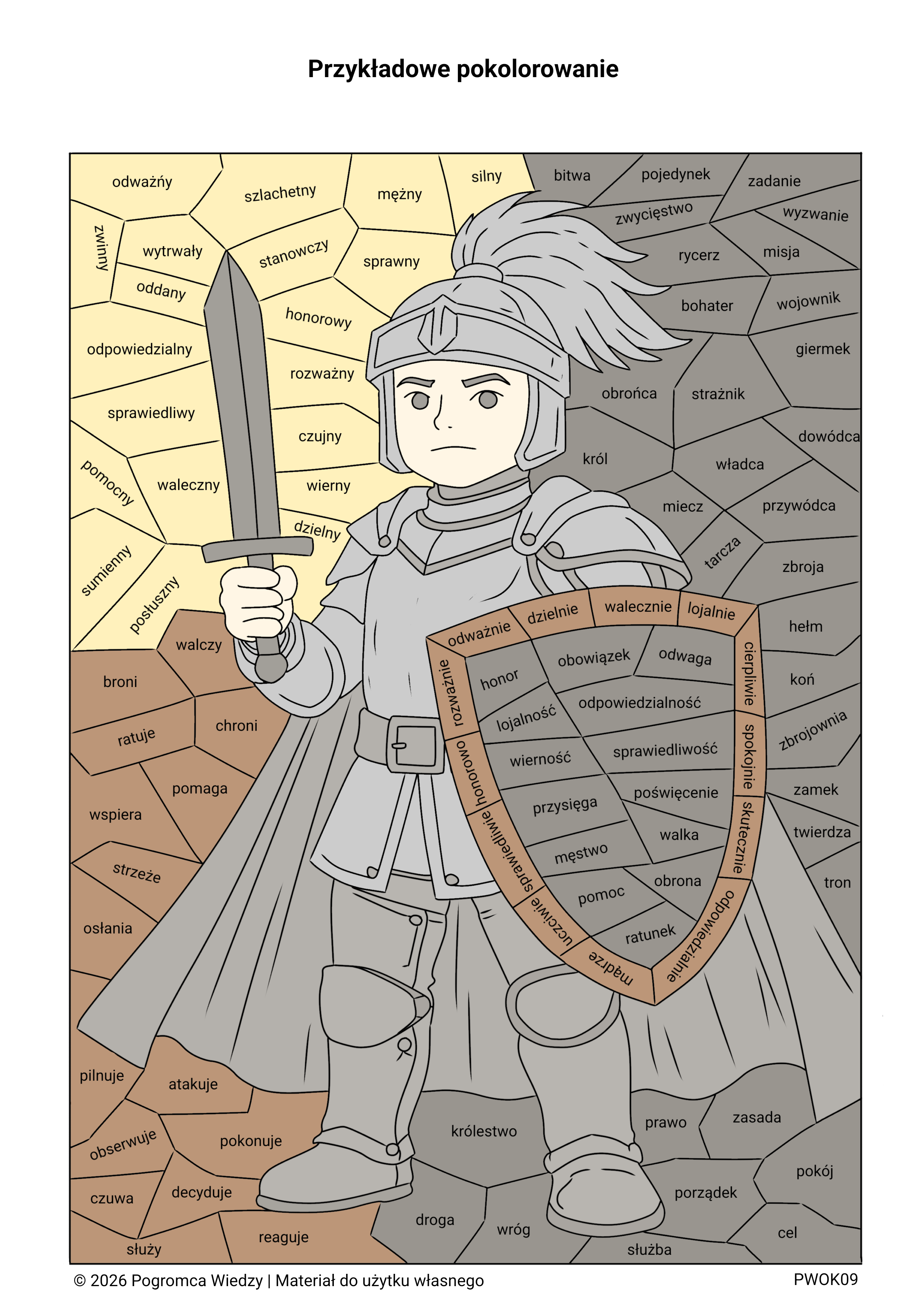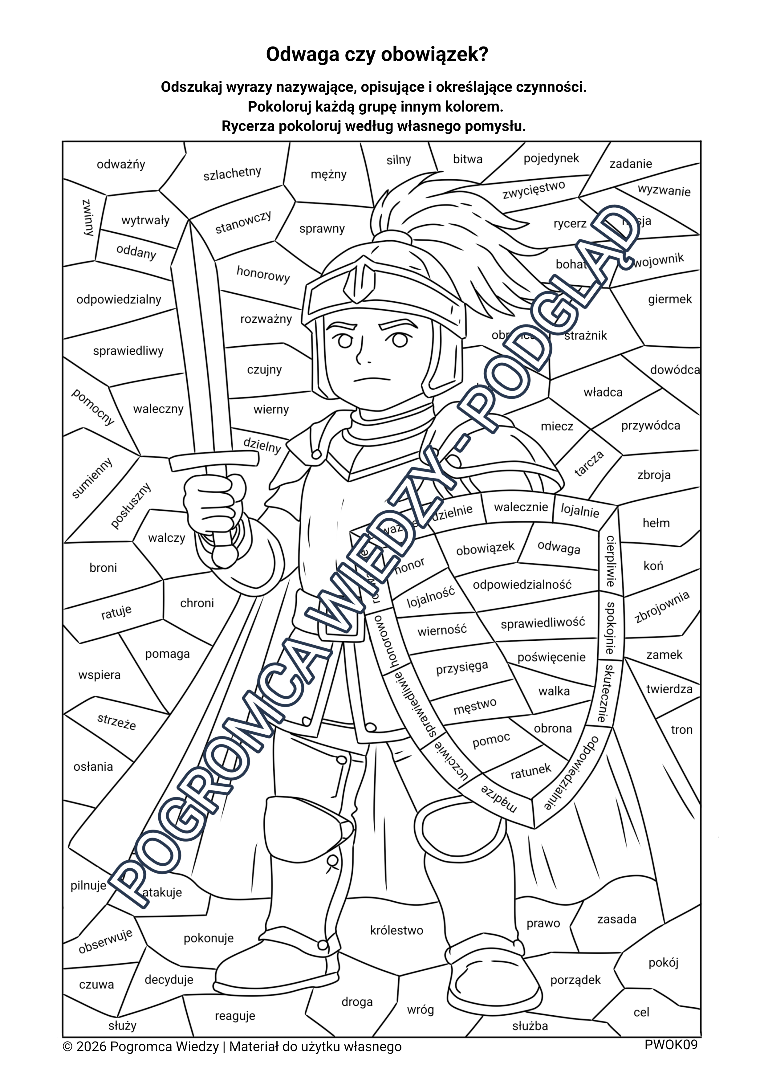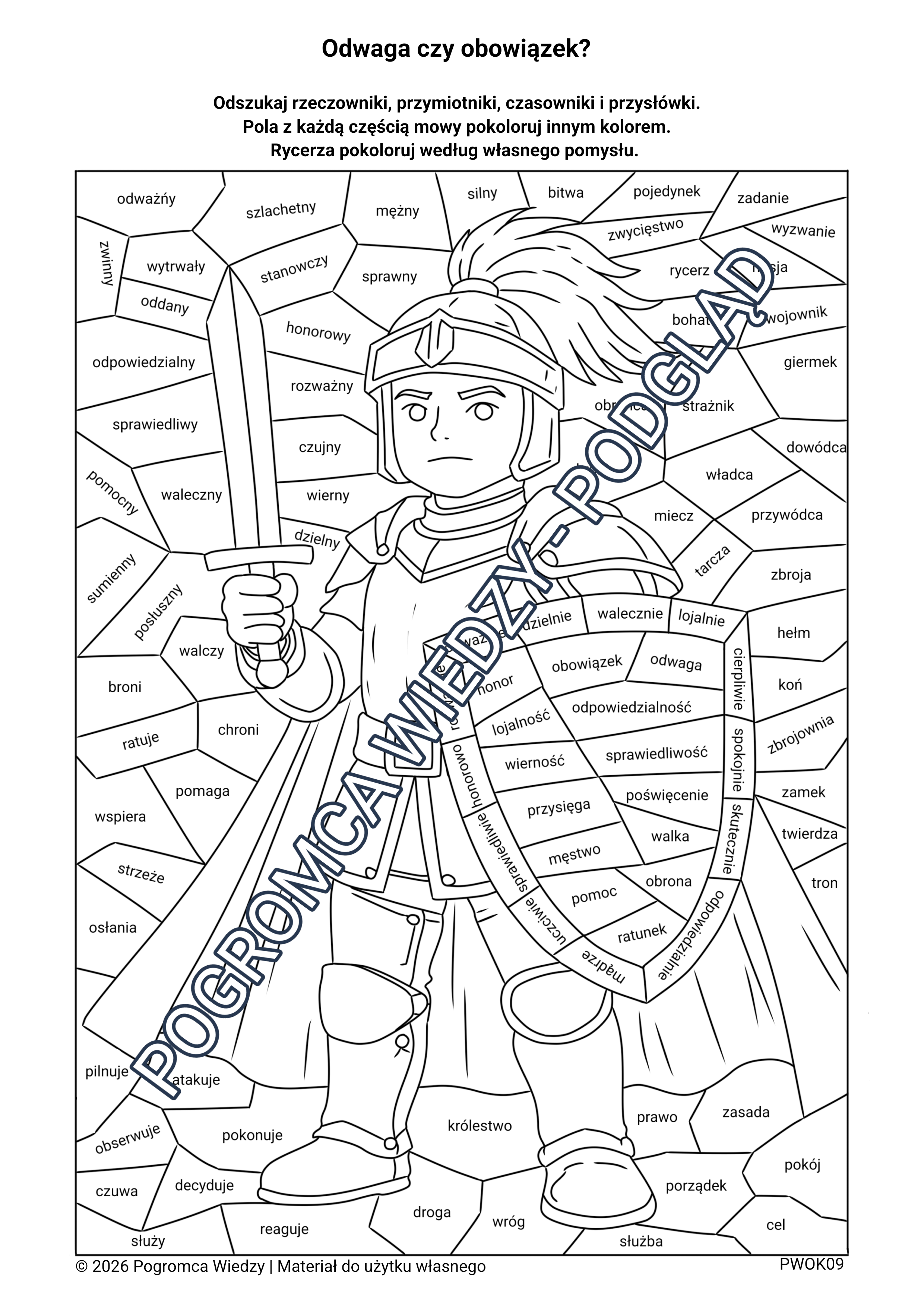 Zestaw dwóch kart pracy z motywem rycerza rozwijających słownictwo i rozpoznawanie części mowy. Zawiera dwa różne polecenia (wersja podstawowa i rozszerzona) oraz klucz odpowiedzi. Atrakcyjna forma mozaiki angażuje uczniów i ułatwia naukę.