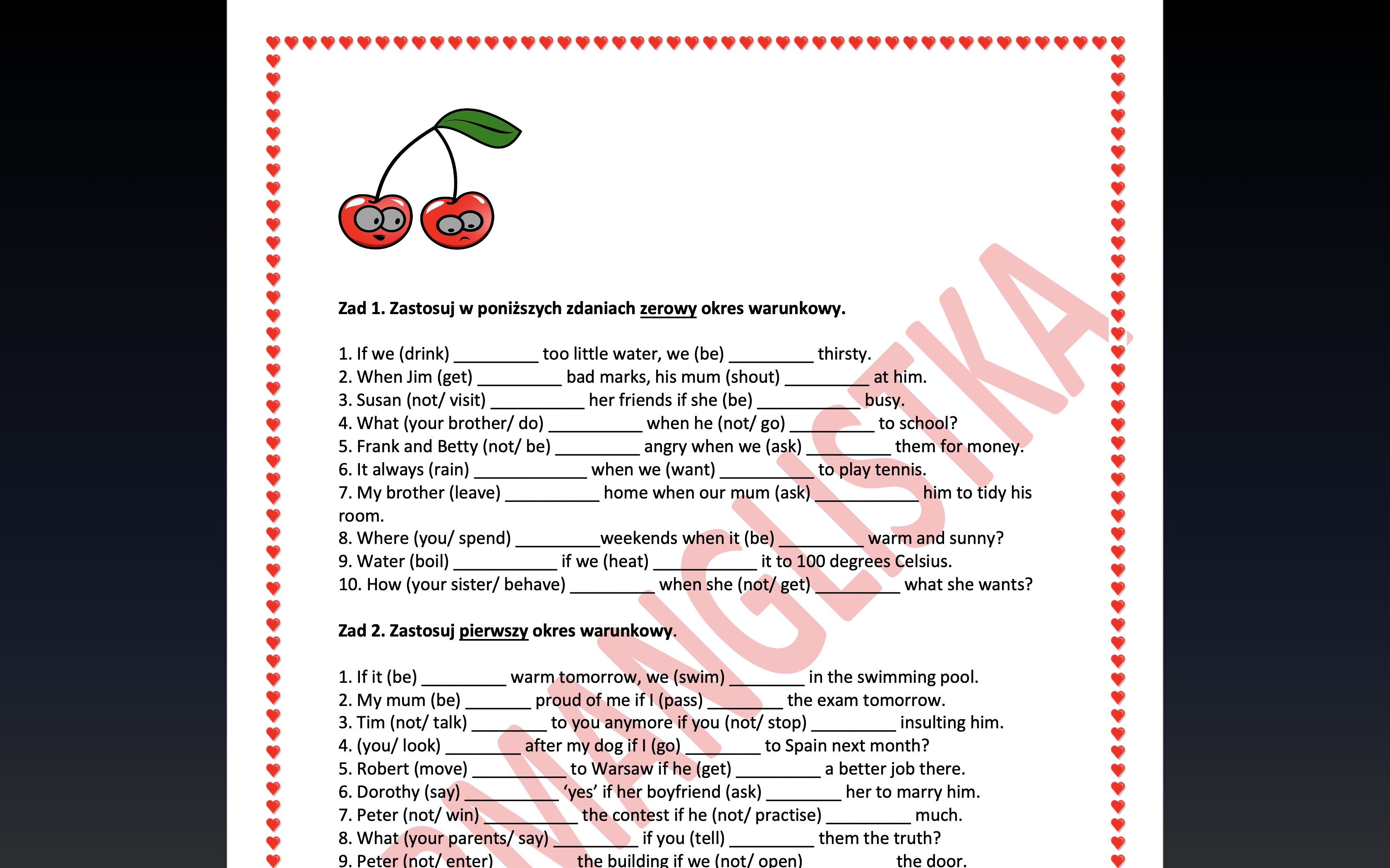 Materiał zawiera 5 ćwiczeń, dzięki którym uczeń utrwali zarówno każdy okres warunkowy (O, I, II) osobno, jak i wszystkie wymieszane razem. Na końcu znajduje się klucz.