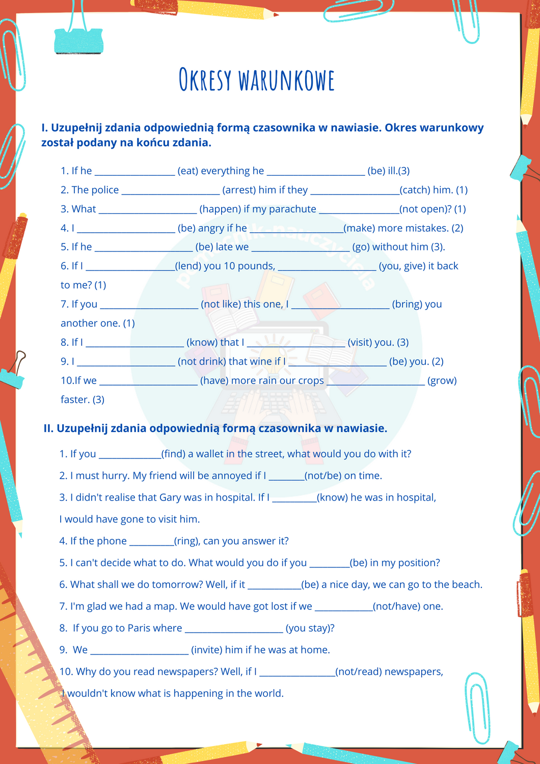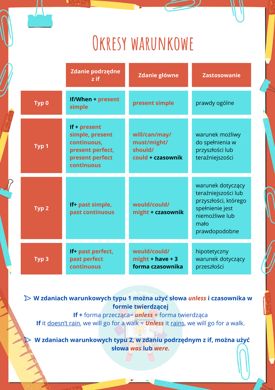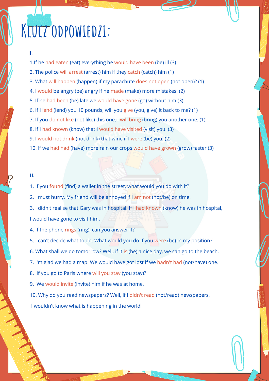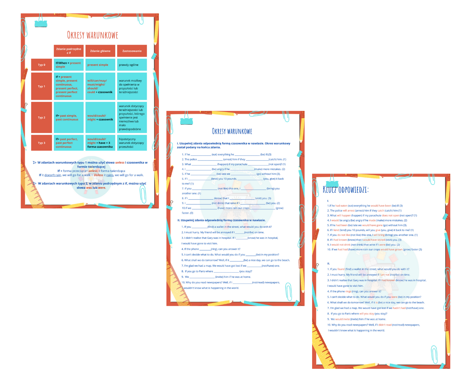 Materiał zawiera plik zapisany w formacie .pdf, w którym znajdują  się: 1. tabela zestawiająca sposób użycia 0, 1,2 i 3 okresu warunkowego. 2. ćwiczenia utrwalające zagadnienie wraz z kluczem odpowiedzi