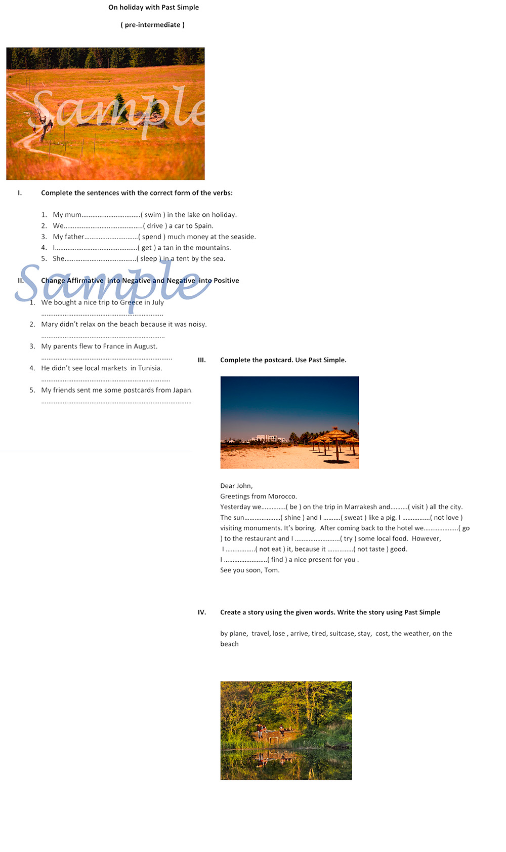 Karta pracy zawierająca ćwiczenia z czasem Past Simple o tematyce wakacyjnej. W sam raz na powtórzenie czasu przeszłego Past Simple tuż po wakacjach.