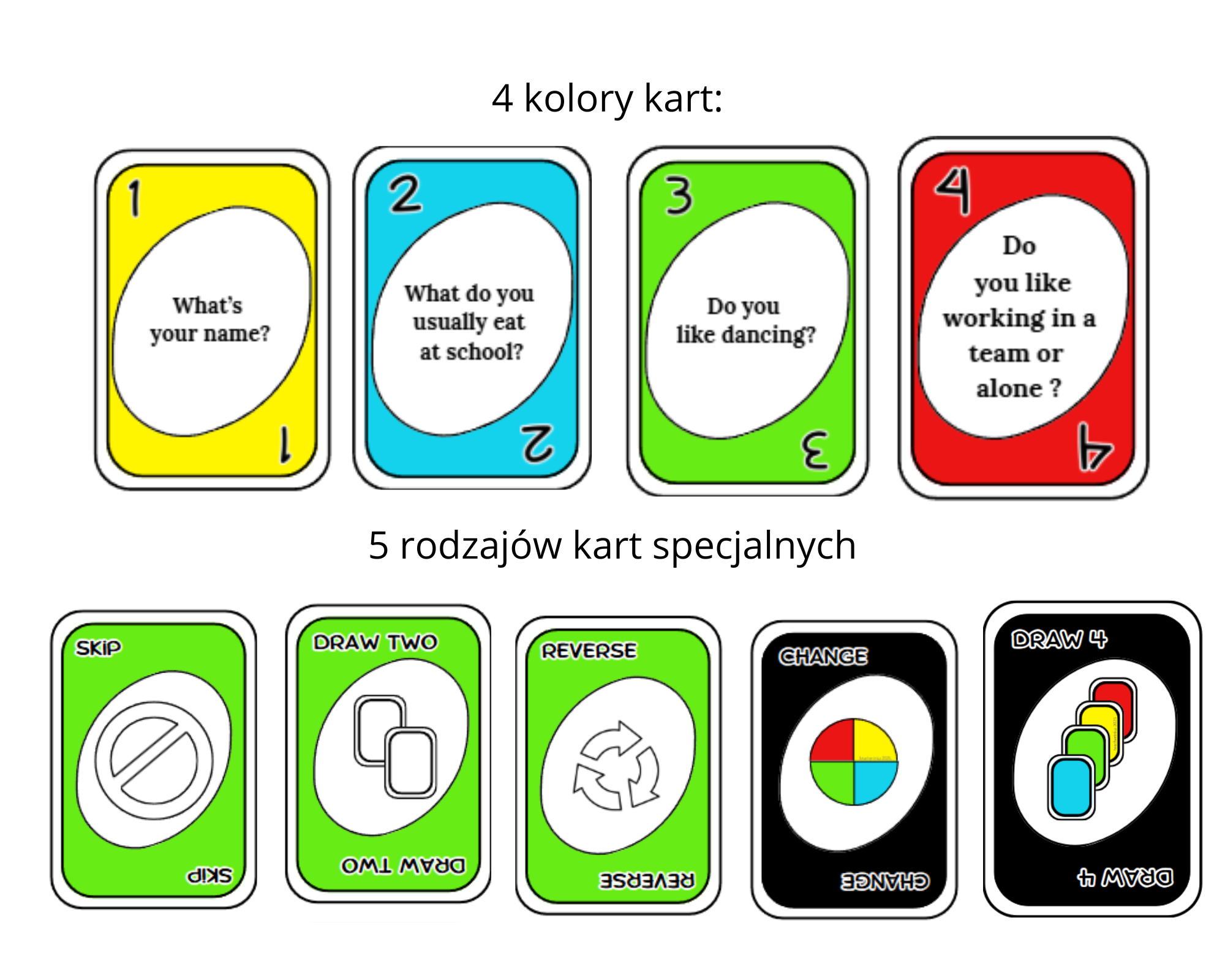 Karty specjalne – DRAW TWO, SKIP, REVERSE, DRAW 4 oraz CHANGE wprowadzają element rywalizacji i dynamiki.