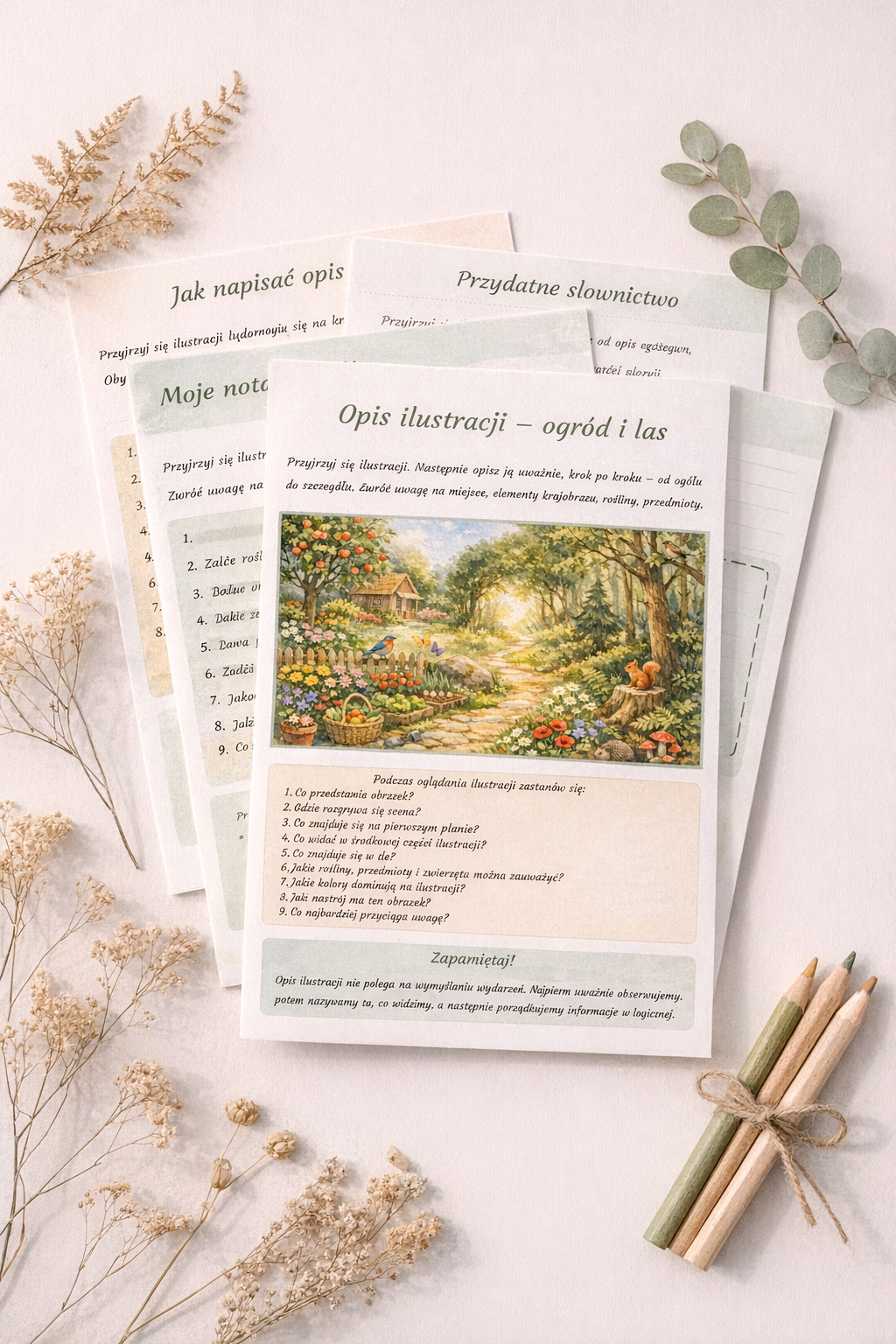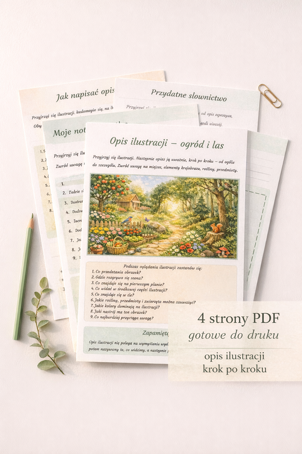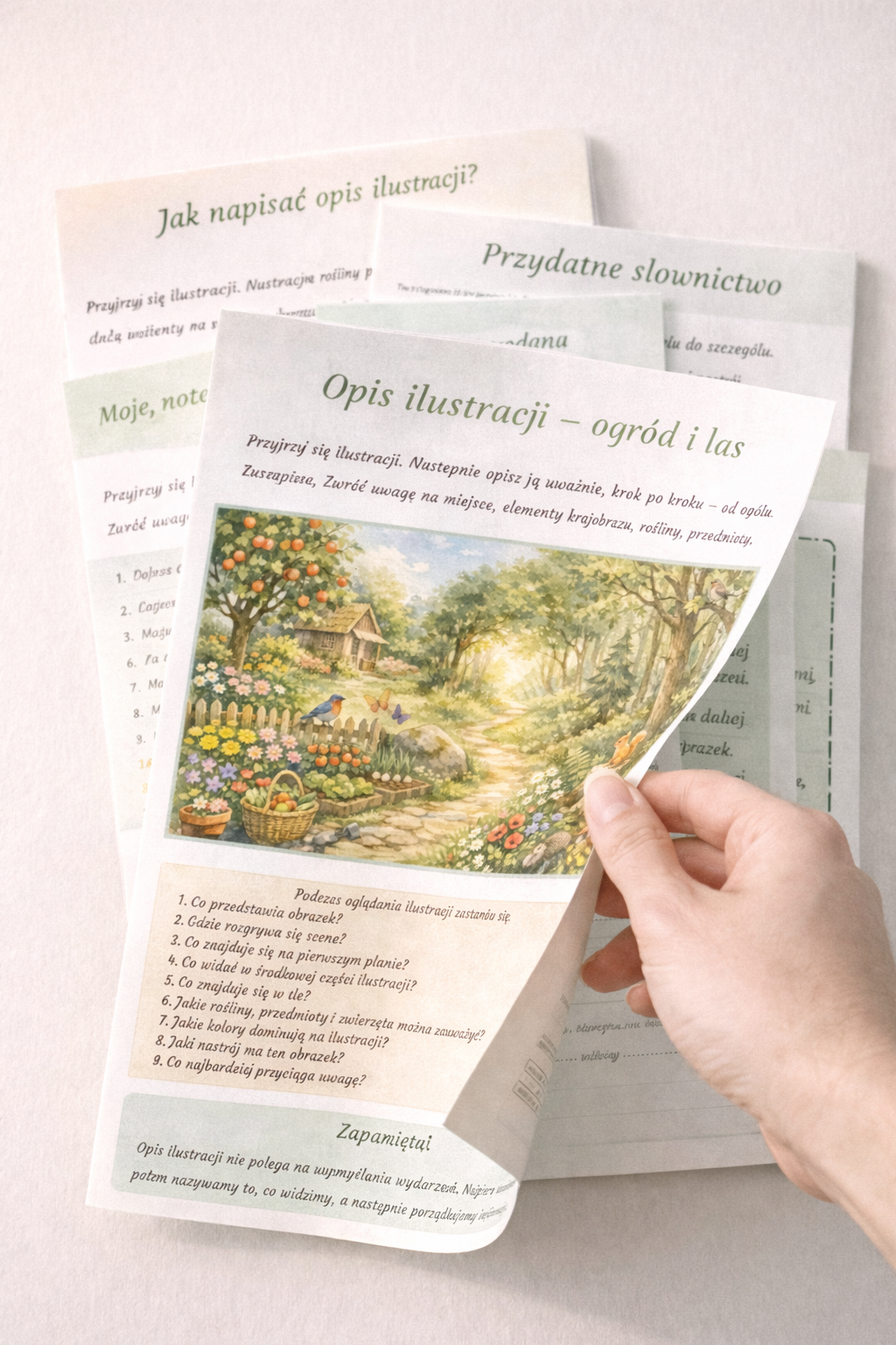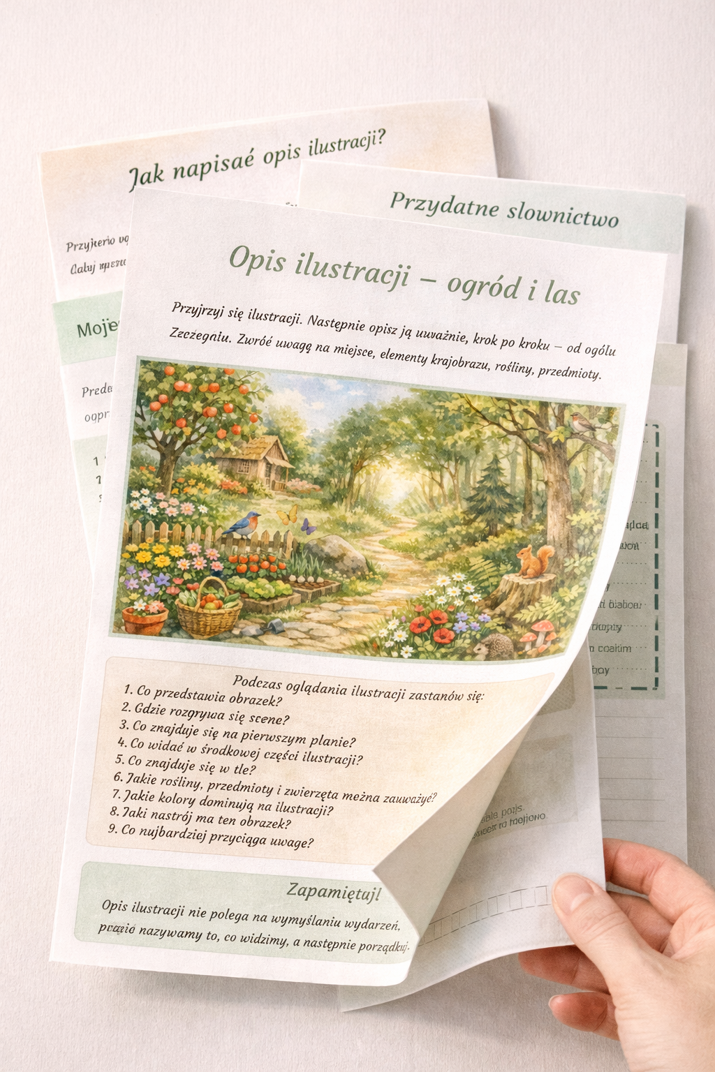 Materiał został przygotowany wokół uroczej ilustracji przedstawiającej ogród na skraju lasu – pełen kwiatów, drzew, zwierząt i ciepłych, naturalnych barw. Dzięki temu dzieci nie tylko ćwiczą pisanie opisu, ale także rozwijają spostrzegawczość, słownictwo oraz wrażliwość estetyczną. Już od pierwszego spojrzenia ilustracja przyciąga uwagę spokojnym, sielskim klimatem i bogactwem szczegółów. 🌼🐿️🐦