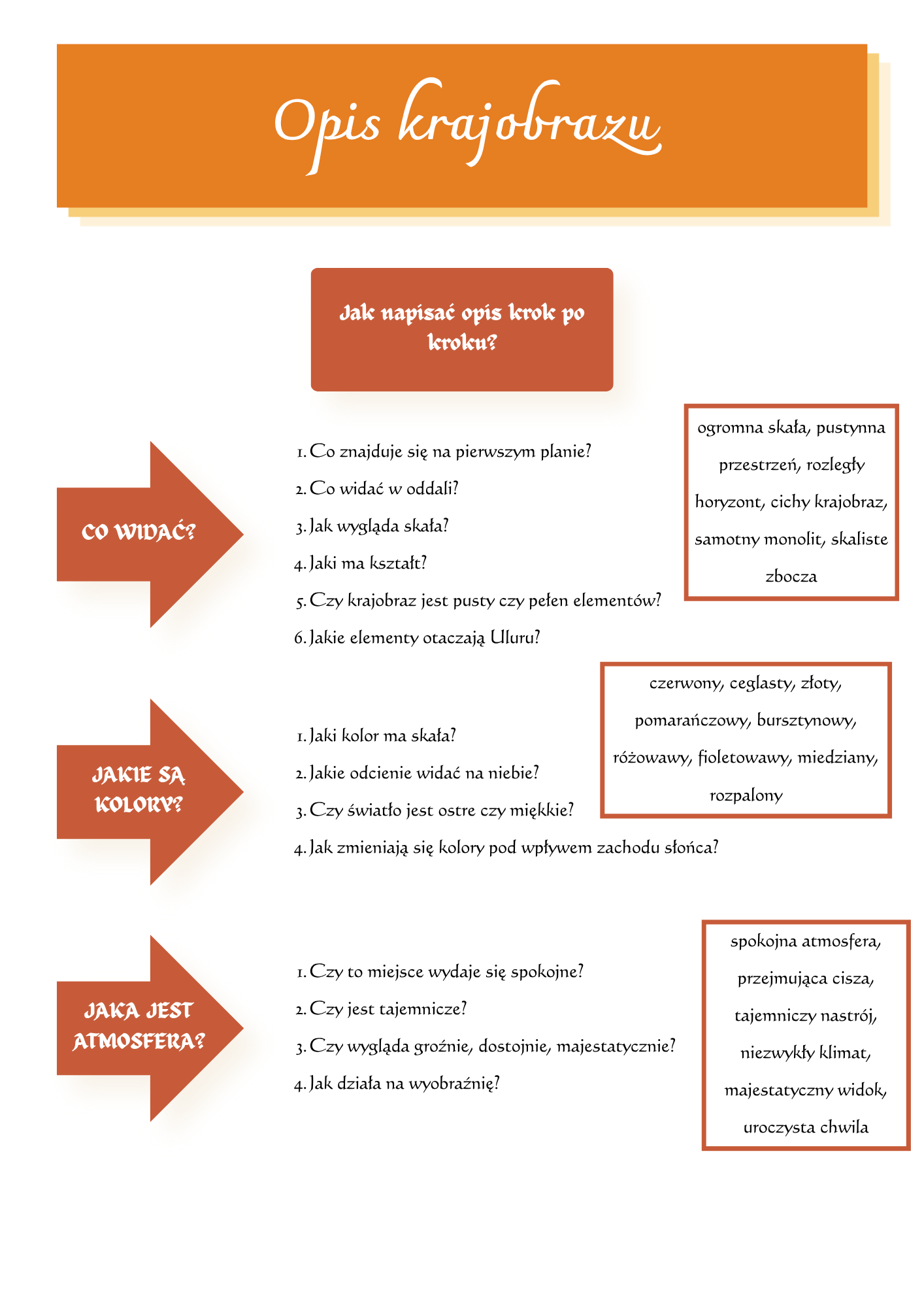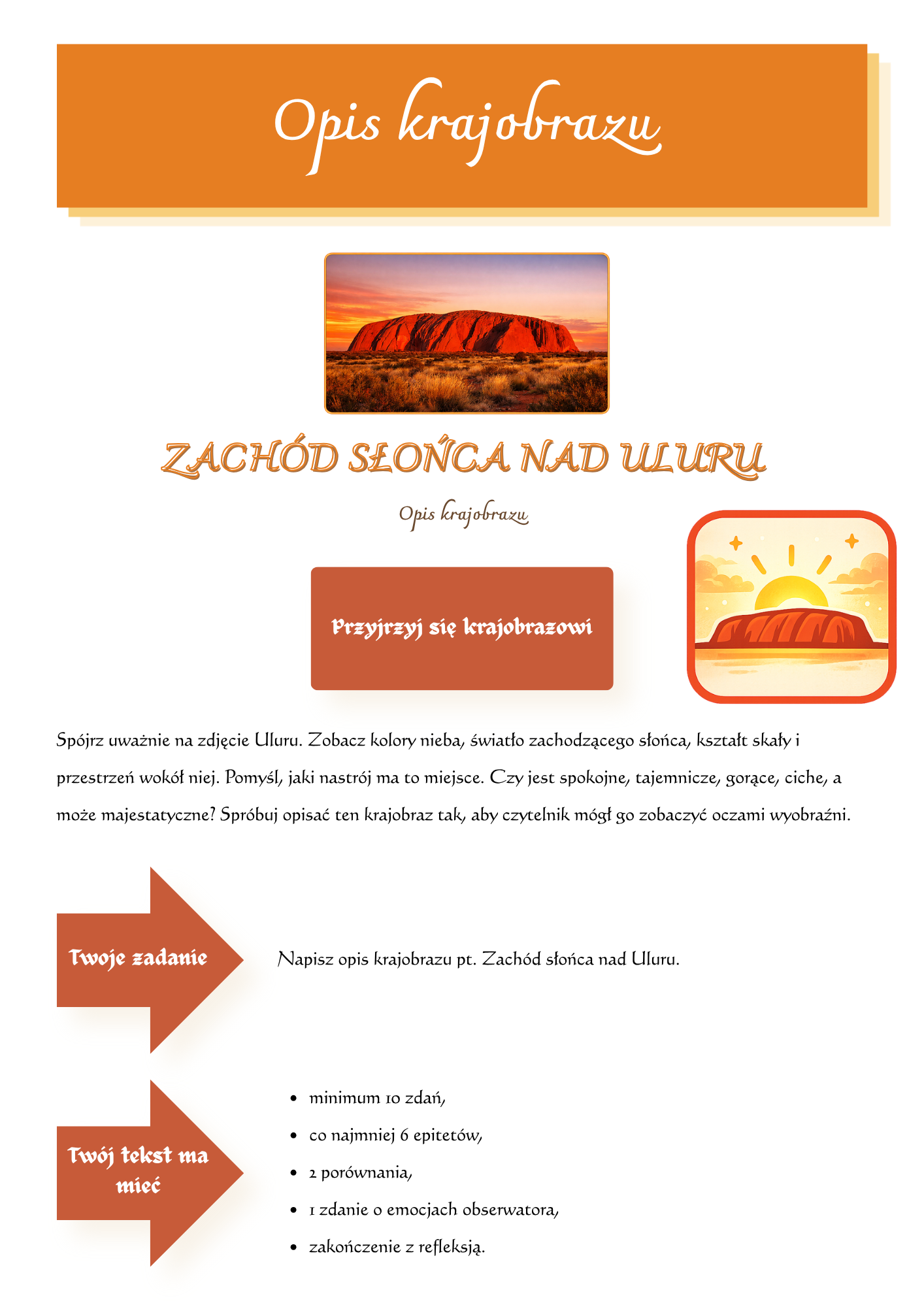 Uczeń uczy się opisywać miejsce, przyrodę, widoki i atmosferę. Pracuje ze słownictwem związanym z krajobrazem, pogodą, kolorami, elementami natury i własnymi wrażeniami. To świetny sposób na rozwijanie umiejętności obserwacji i budowania pięknych, obrazowych zdań.