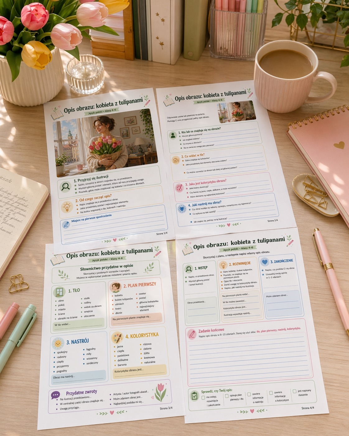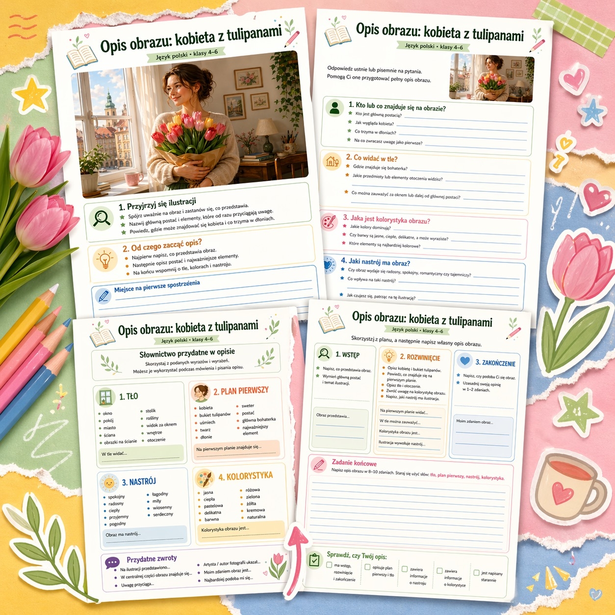 To 4-stronicowa karta pracy z języka polskiego dla klas 4–6, która pomaga uczniom napisać opis obrazu lub fotografiina przykładzie tematu „kobieta z tulipanami”. Materiał krok po kroku prowadzi dziecko przez obserwację ilustracji, odpowiadanie na pytania pomocnicze, poznawanie potrzebnego słownictwa oraz samodzielne napisanie pełnego opisu. 🌷📚