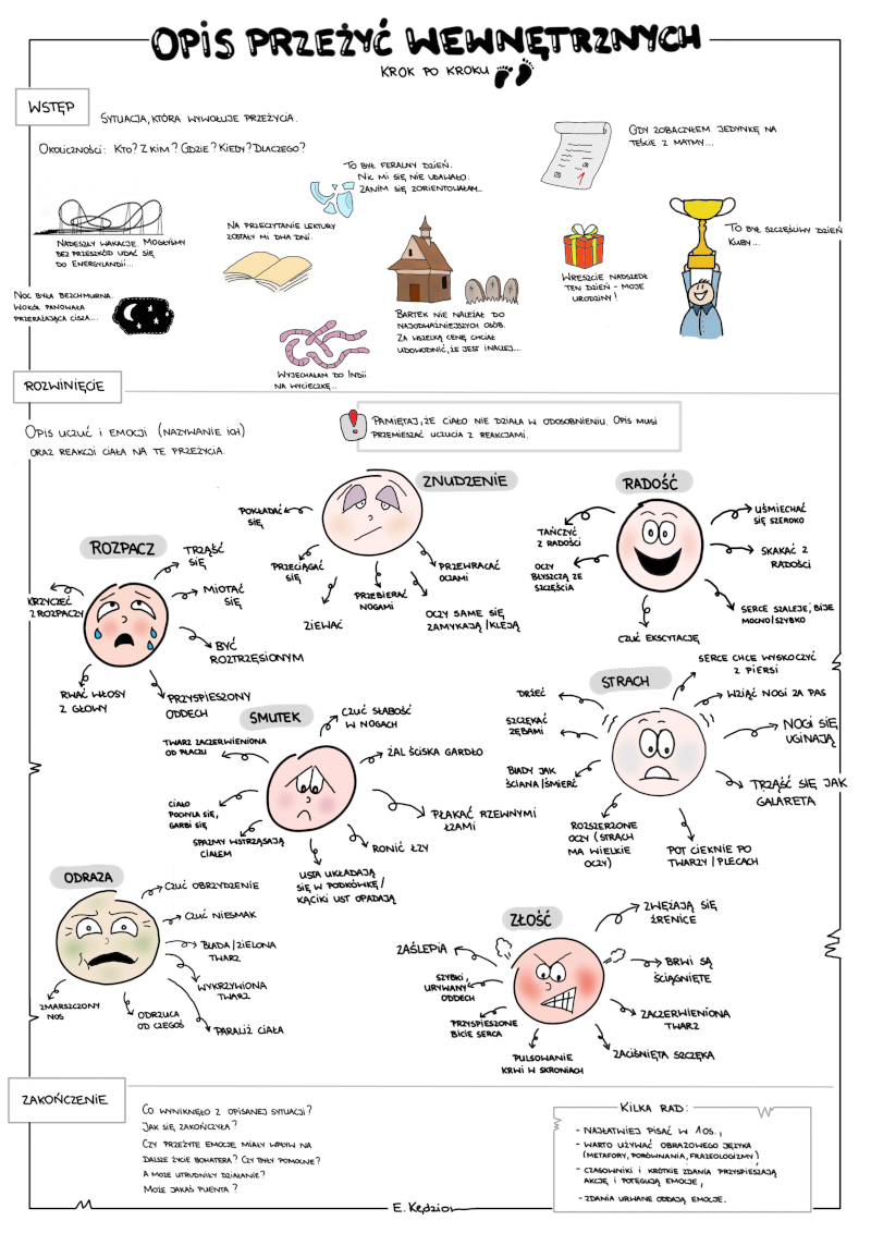 W zestawie jedna karta w trzech wariantach: - pusta, czarno-biała do wypełnienia przez ucznia, - pusta, kolorowa do wypełnienia przez ucznia. - kolorowa i wstępnie wypełniona. Karta ma przeprowadzić ucznia krok po kroku przez tworzenie opisu przeżyć wewnętrznych. Na YT (Polonistka Youtuberka) znajduje się film z wykorzystaniem tej karty i przykładowym opisem przeżyć wewnętrznych.