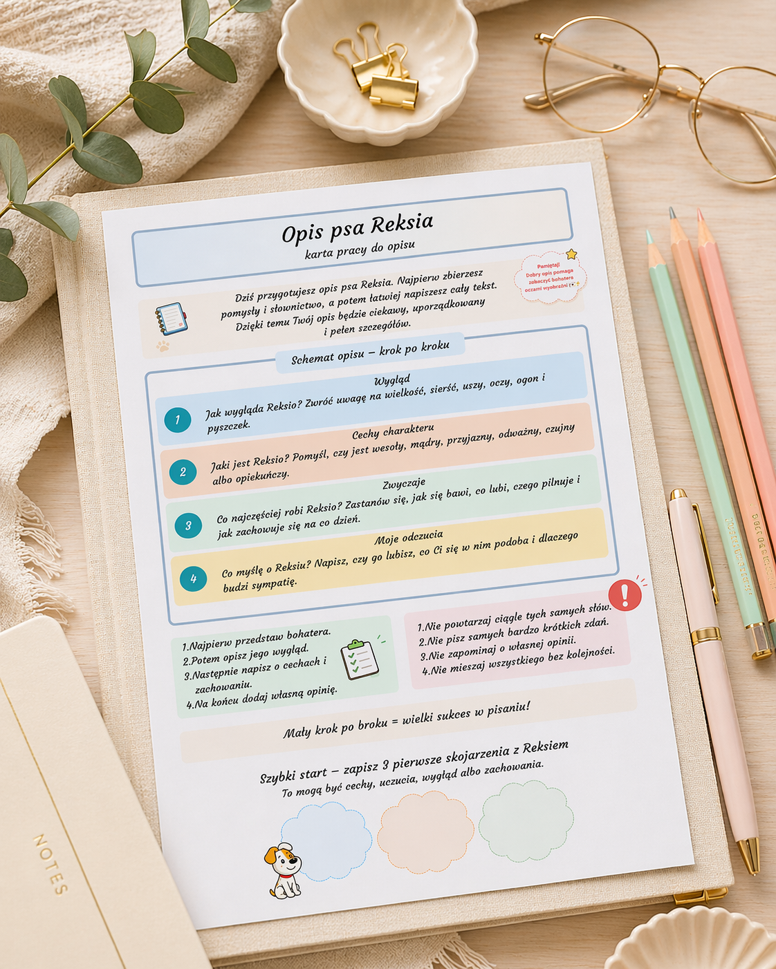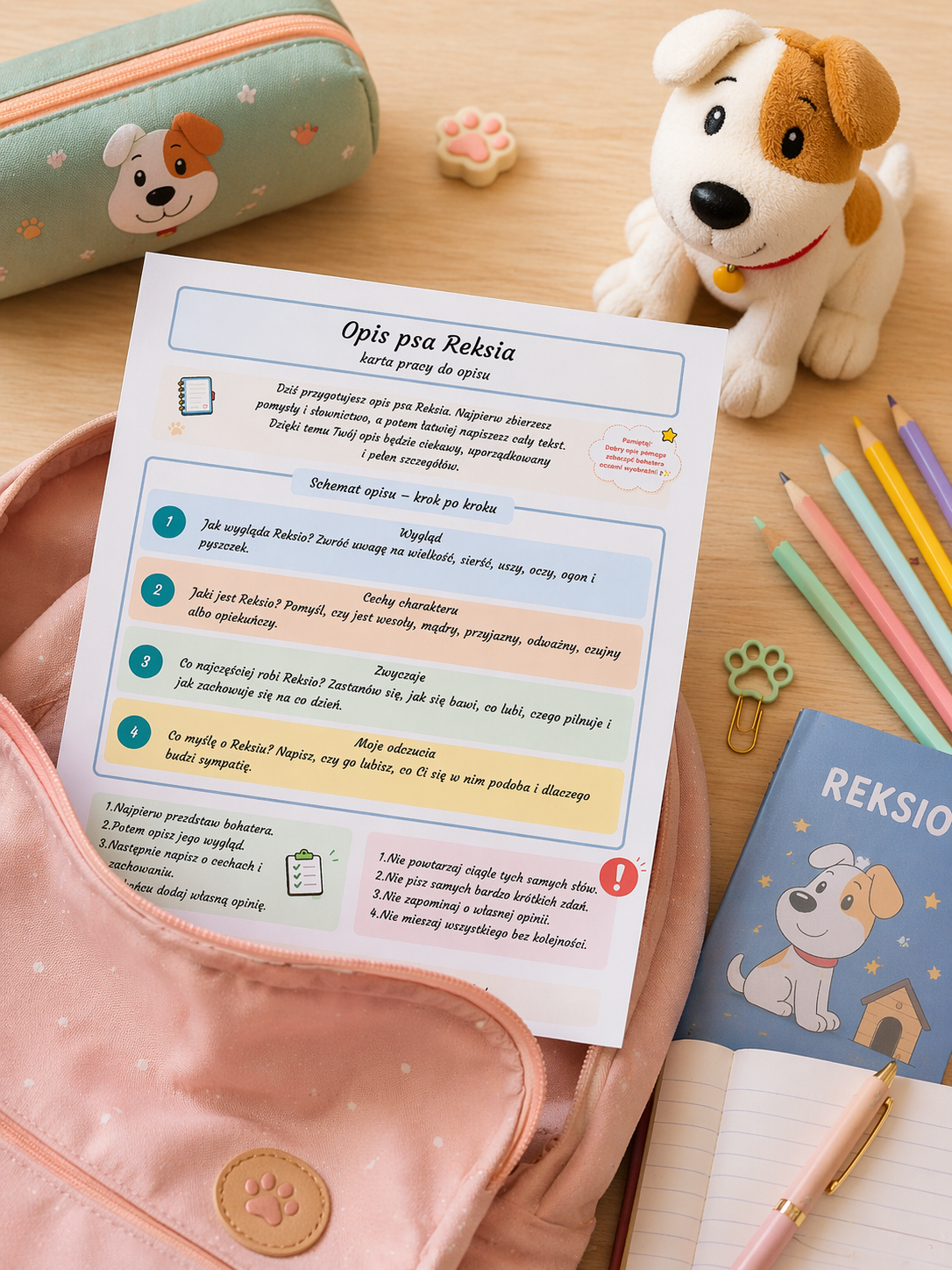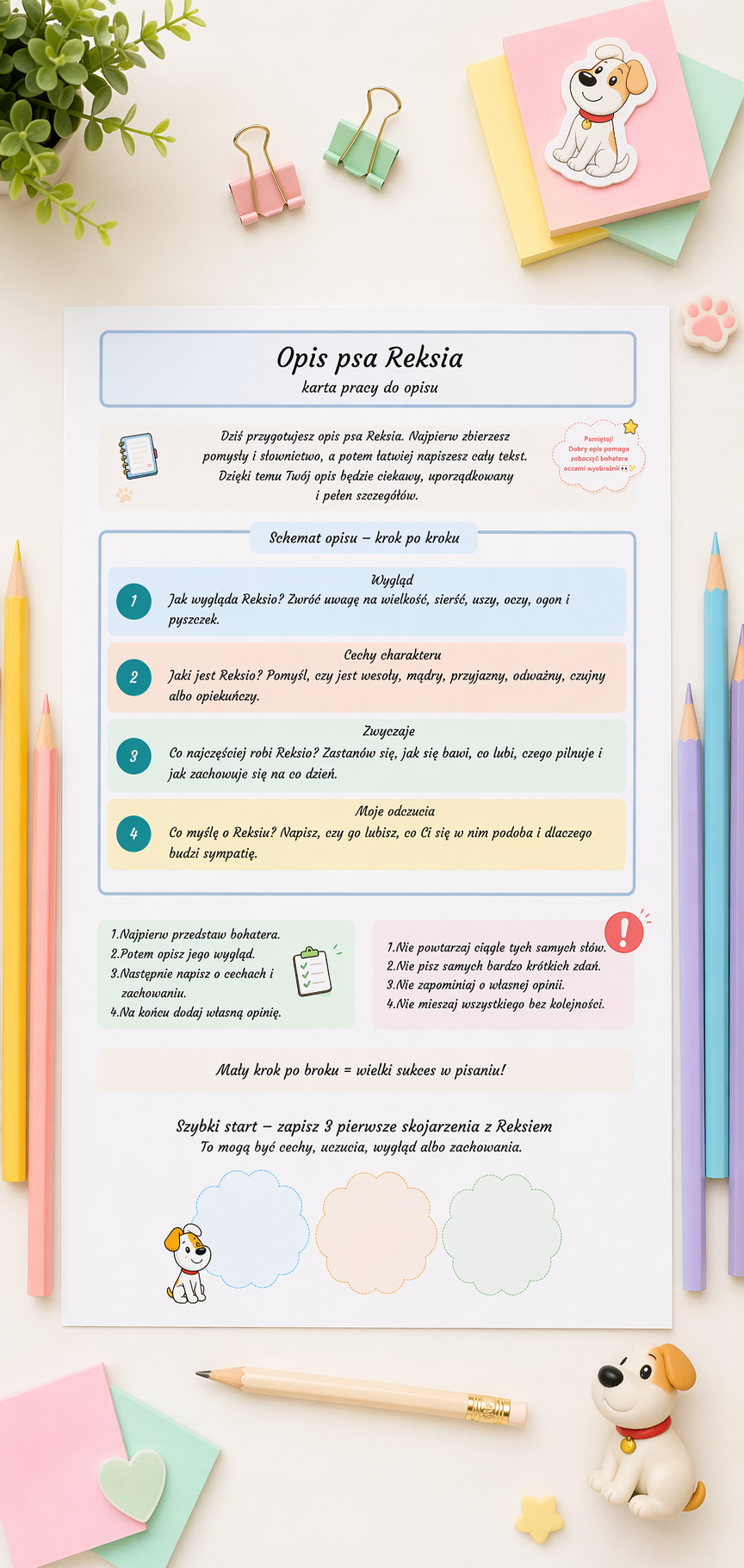 Ja przygotowałam tę kartę pracy, aby w prosty i uporządkowany sposób pomóc uczniom nauczyć się pisać opis postaci – na przykładzie sympatycznego psa Reksia 🐾. Materiał prowadzi krok po kroku przez cały proces tworzenia wypowiedzi, dzięki czemu uczniowie czują się pewniej i piszą bardziej świadomie.
