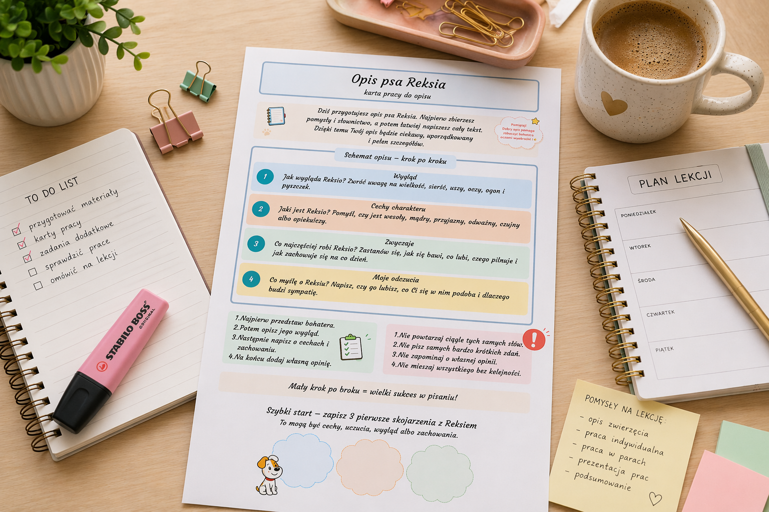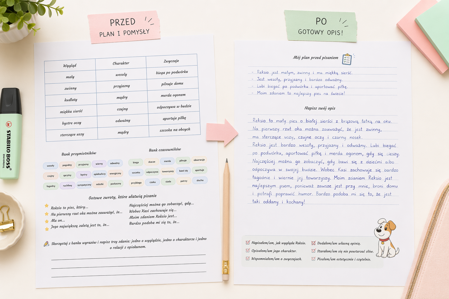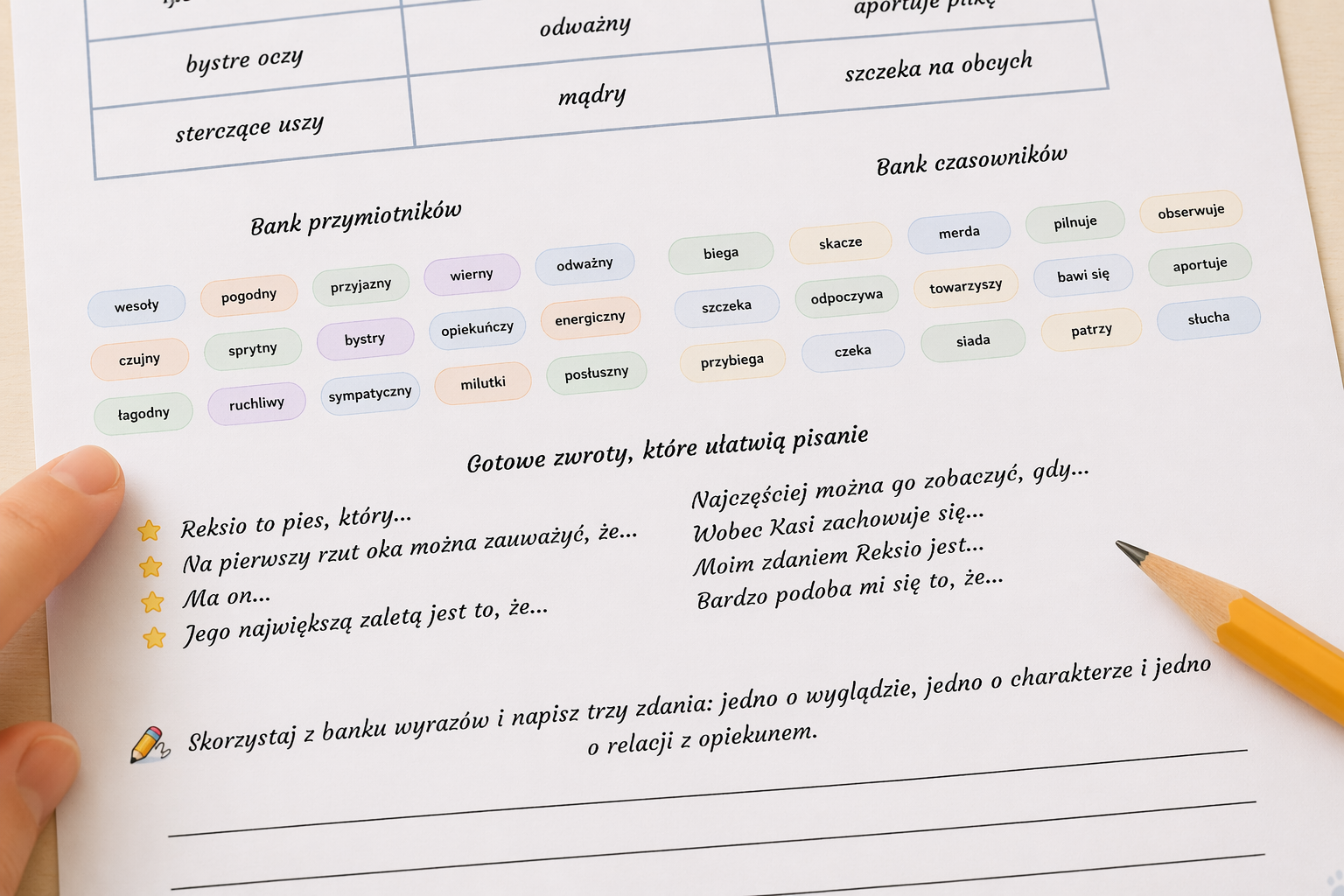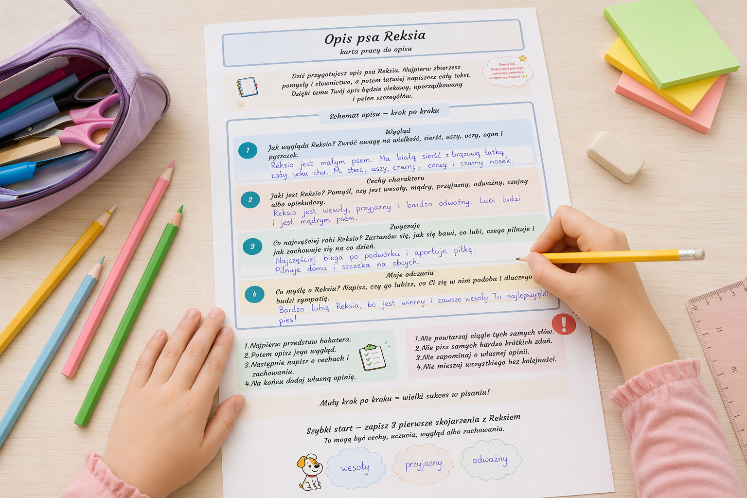 • 🎨 bank przymiotników i czasowników, aby uczniowie mogli wzbogacać swoje wypowiedzi