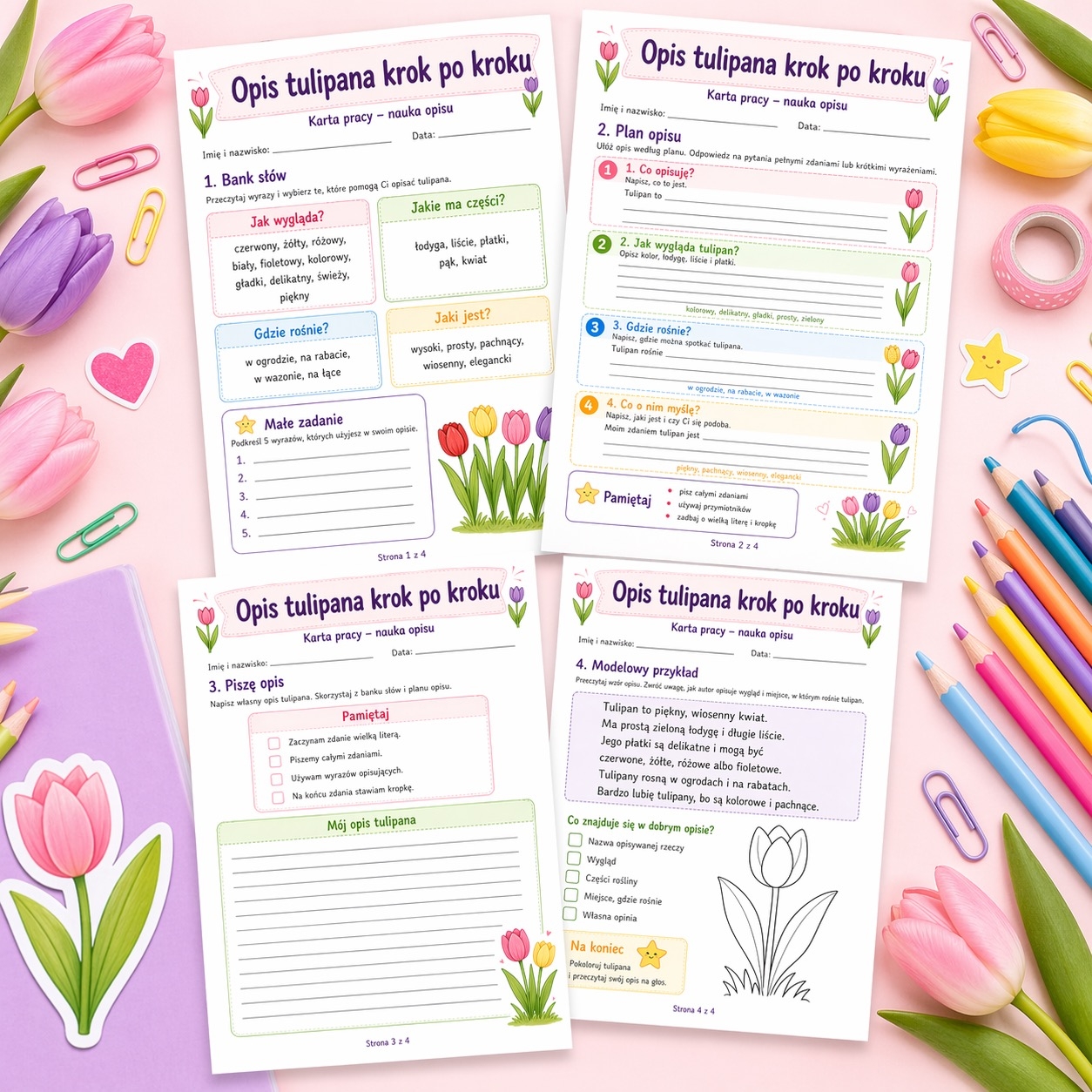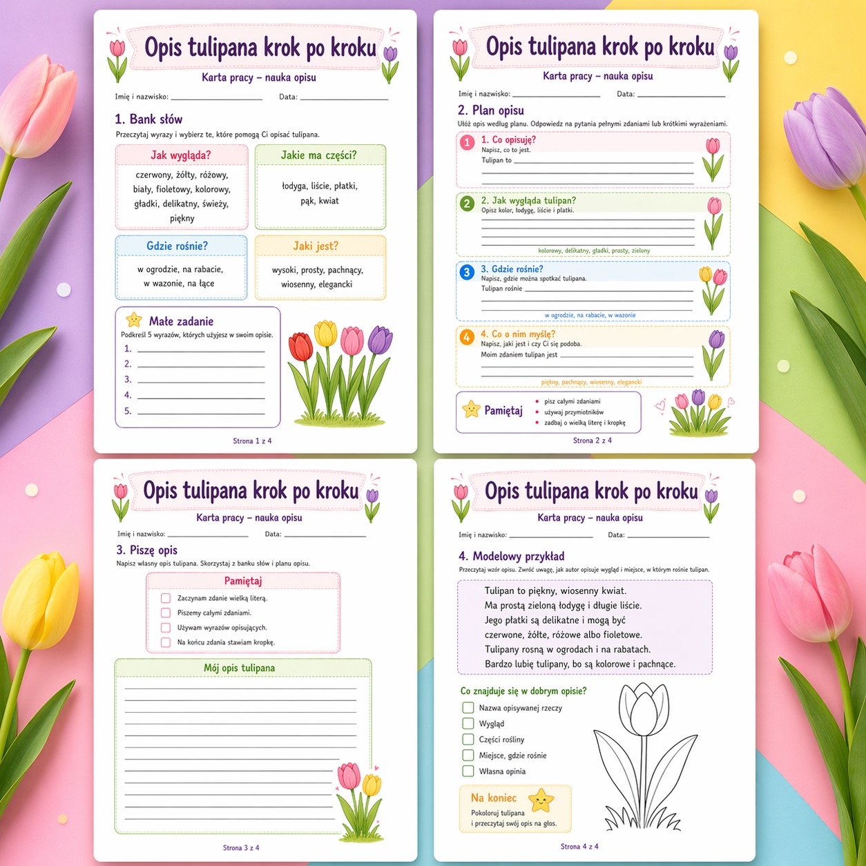 Przygotowałam kartę pracy, która pomaga dzieciom krok po kroku napisać opis tulipana. Materiał zawiera bank słów, plan opisu, miejsce na samodzielne pisanie oraz modelowy przykład. Dzięki temu uczniowie łatwiej uczą się tworzyć spójne, poprawne i ciekawe opisy. To świetna pomoc na lekcje edukacji polonistycznej w klasach 2–3. ✍️📚