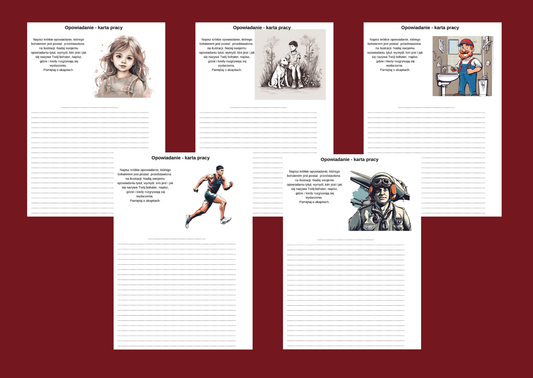 Zestaw 8 kart pracy z ilustracjami różnych postaci. Zadanie uczniów polega na napisaniu krótkiego opowiadania, którego bohaterem jest postać przedstawiona na ilustracji.