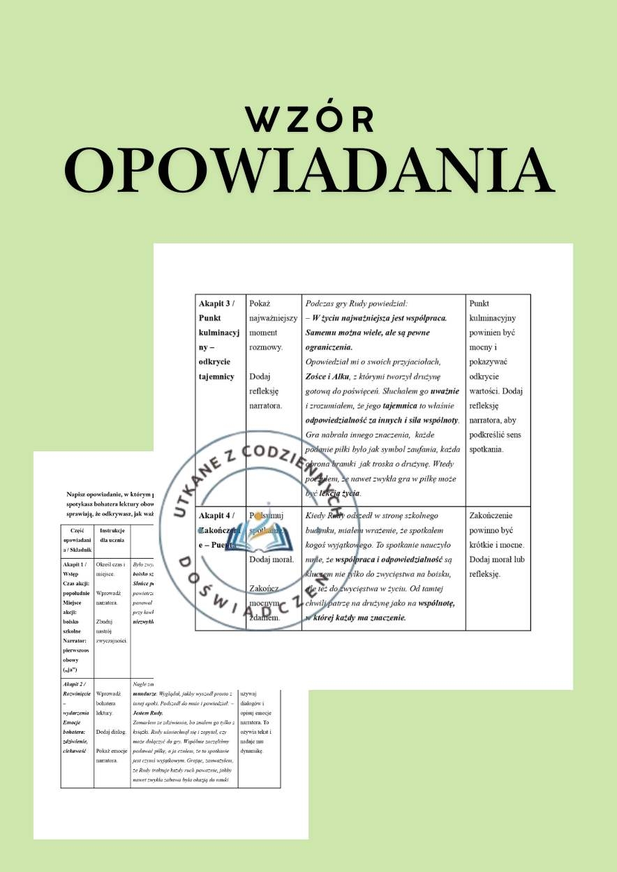 ✅ Przejrzysta struktura – wstęp, rozwinięcie, kulminacja i zakończenie są jasno rozpisane.