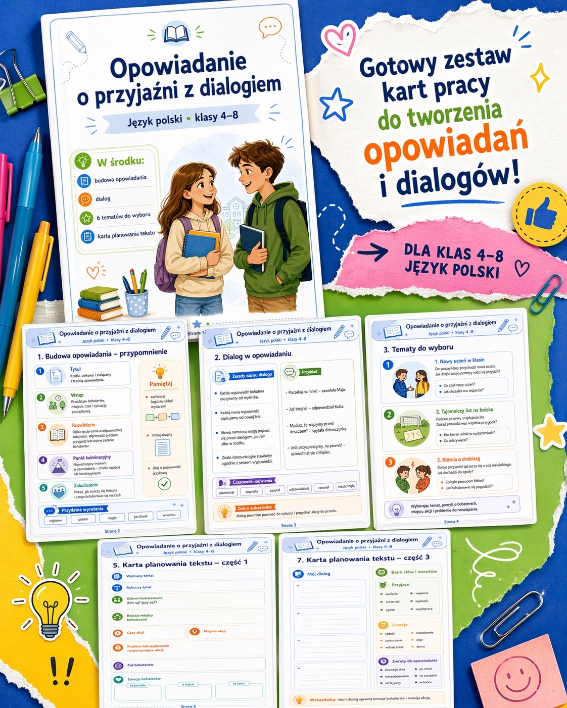 Zestaw pomaga krok po kroku zaplanować i napisać ciekawe opowiadanie o przyjaźni, w którym pojawia się dialog. W środku znajduje się przypomnienie budowy opowiadania, przejrzysta plansza o zapisie dialogu, 6 tematów do wyboru oraz karta planowania tekstu. Na końcu uczniowie mogą skorzystać także z karty samooceny ✅