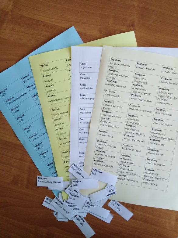 Kartki należy wydrukować, wyciąć (przedtem można zalaminować - posłużą dłużej). Uczeń losuje wyrazy z każdej kategorii i redaguje opowiadanie.