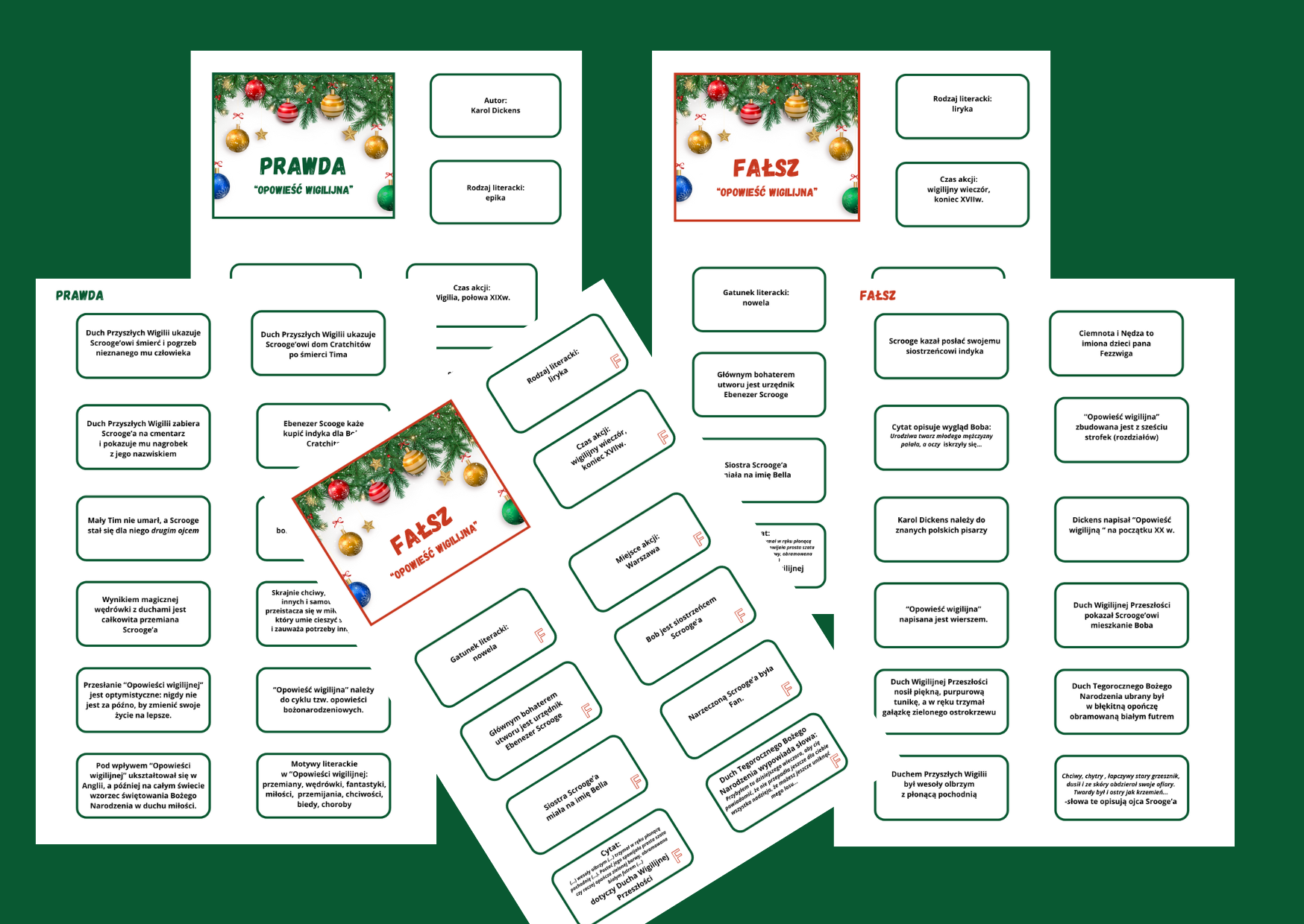 Materiał zawiera 68 fiszek dotyczących treści "Opowieści wigilijnej" (6 stron). Na fiszkach znajdują się stwierdzenia dotyczące utworu Dickensa – zadaniem uczniów jest posegregowanie ich na zdania prawdziwe i zdania fałszywe.