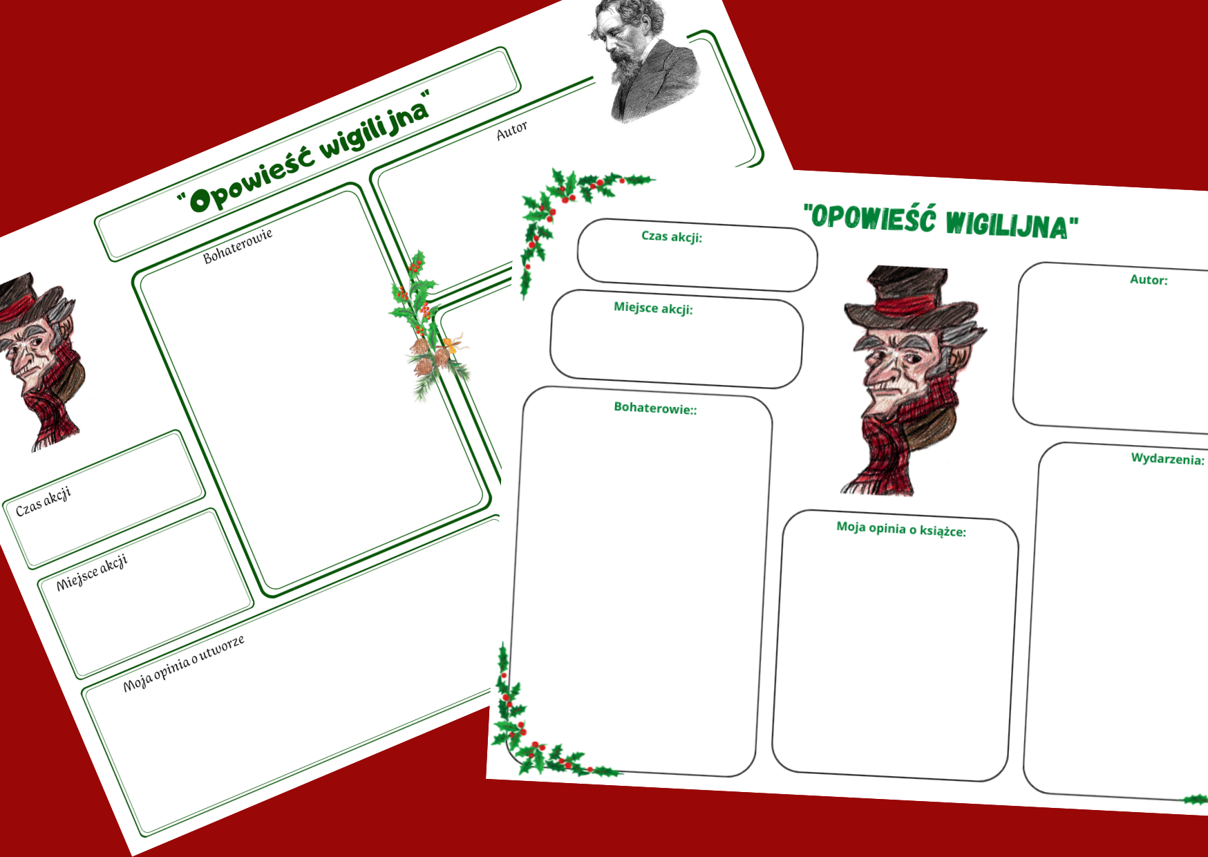 Zestaw dwóch wersji karty pracy dotyczącej świata przedstawionego "Opowieści Wigilijnej".