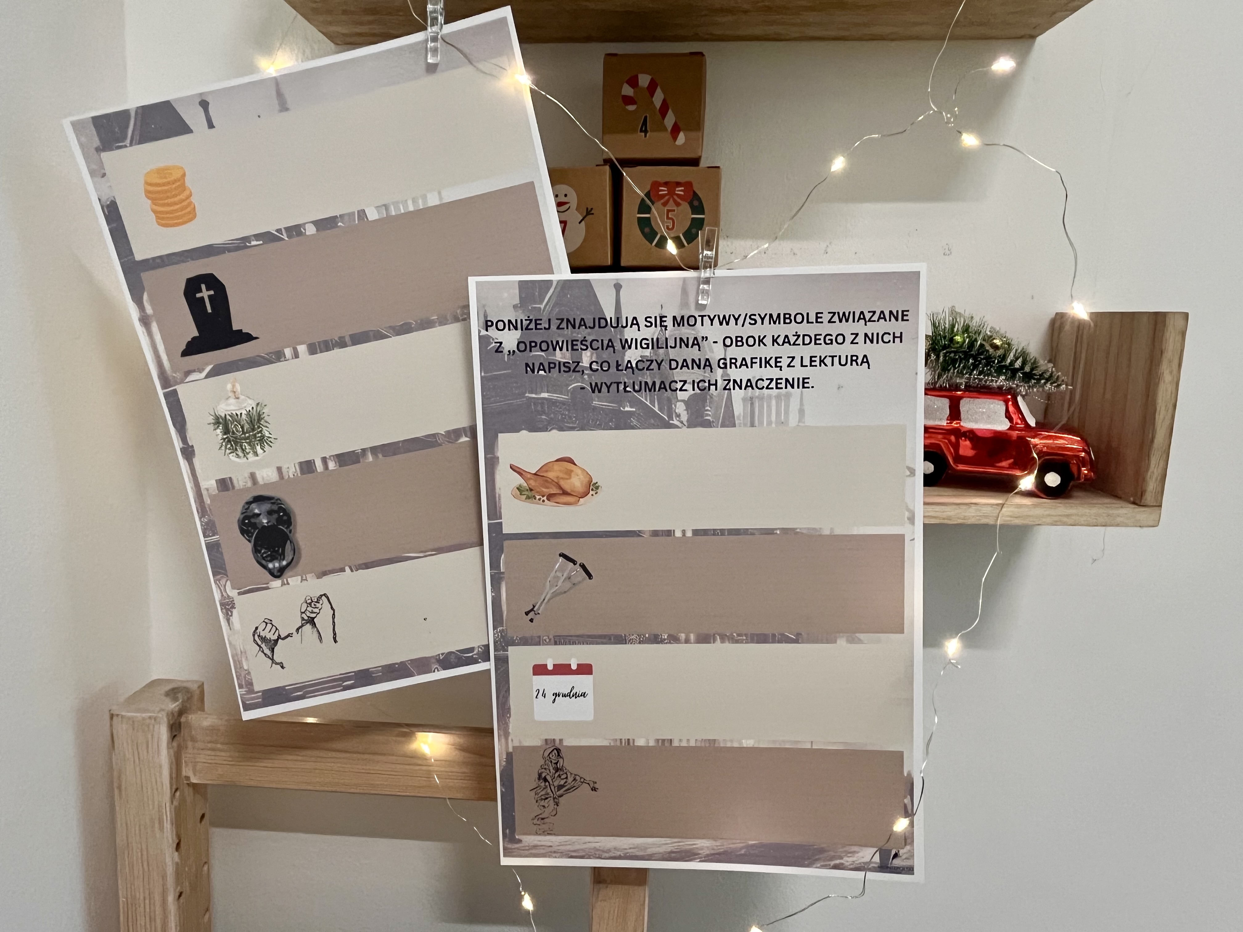 Na kartach umieściłam symbole związane z "Opowieścią wigilijną", zadaniem ucznia jest napisać w pustych polach, co dane symbole oznaczają.