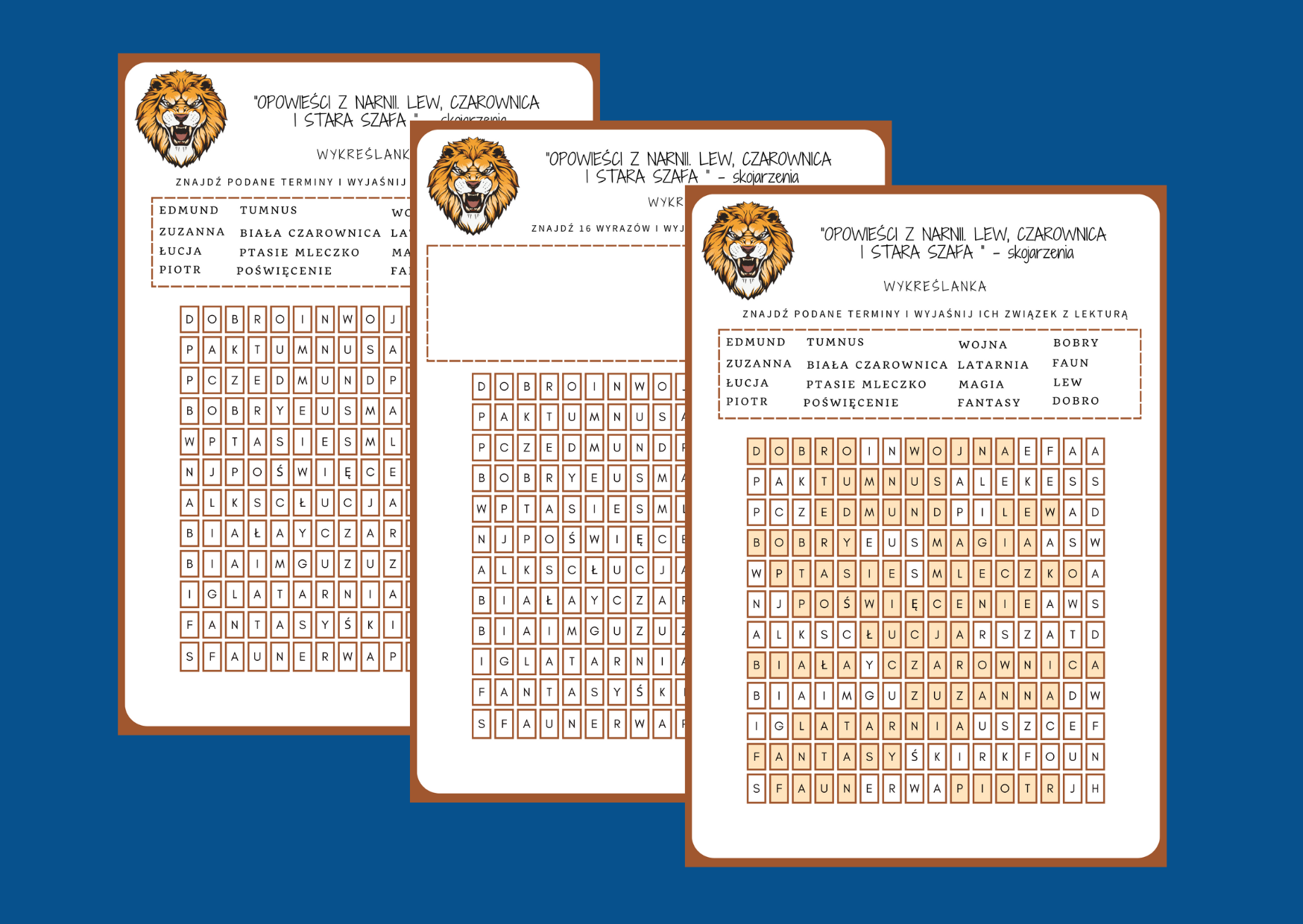 Materiał zawiera wykreślankę dotyczącą „Opowieści z Narnii. Lew, czarownica i stara szafa” (3 wersje: z odpowiedziami, bez odpowiedzi, bez wyrazów do odnalezienia).