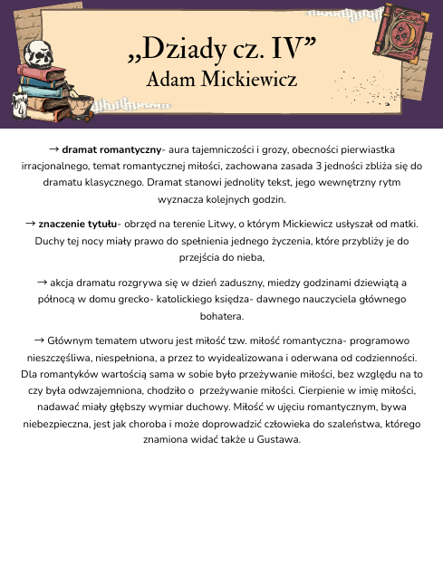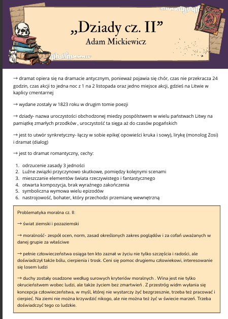 Lektury: - ,,Lilie" - ,,Rozdzióbią nas kruki, wrony" - ,,Chłopi" - ,,Dziady II" - ,,Dziady III" - ,,Dziady IV" - ,,Dżuma rozdział po rozdziale" - ,,Inny świat" - ,,Księga rodzaju"
