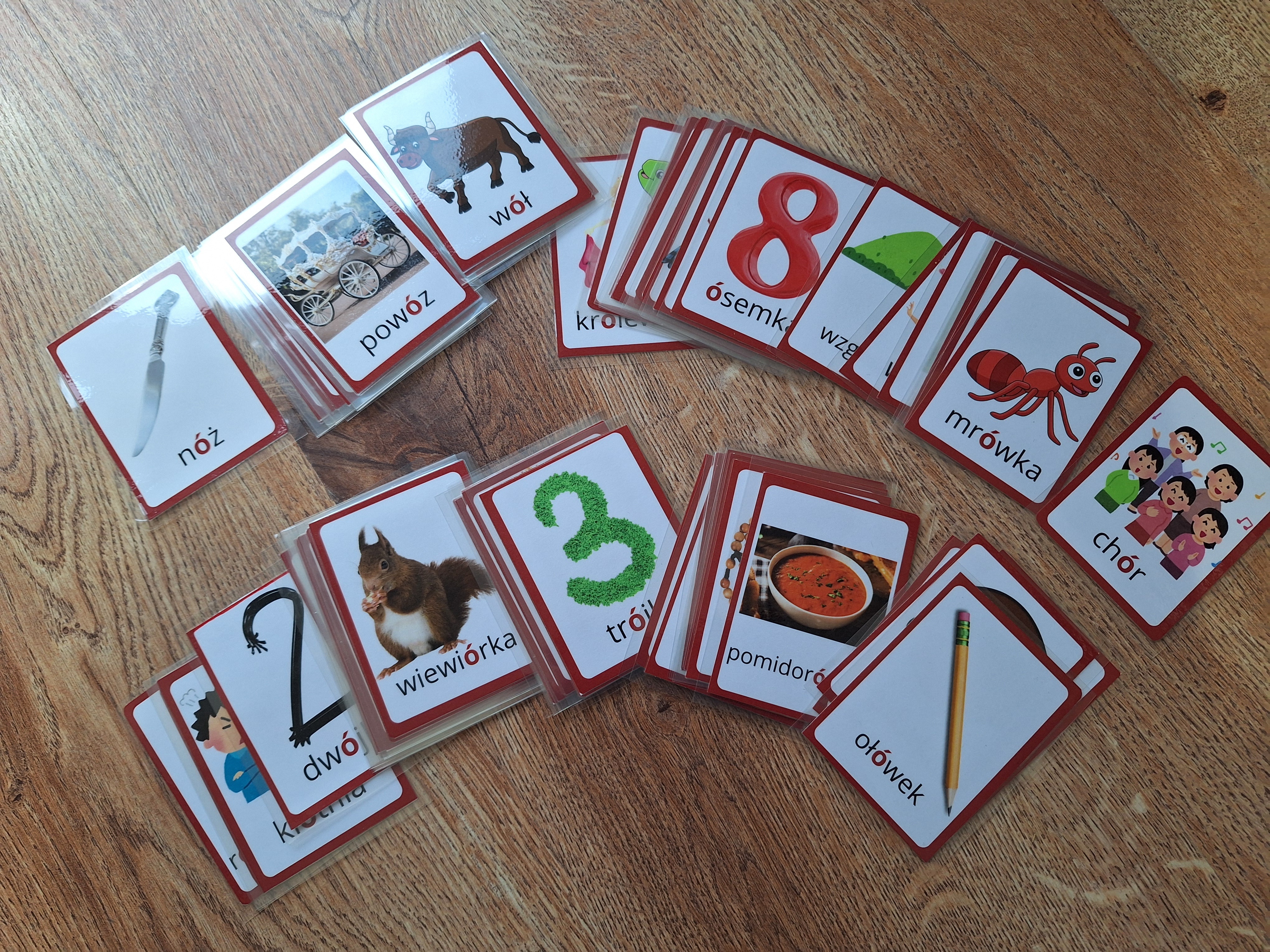 Karty można wykorzystać również do nauki alfabetu oraz układania wyrazów w kolejności alfabetycznej.