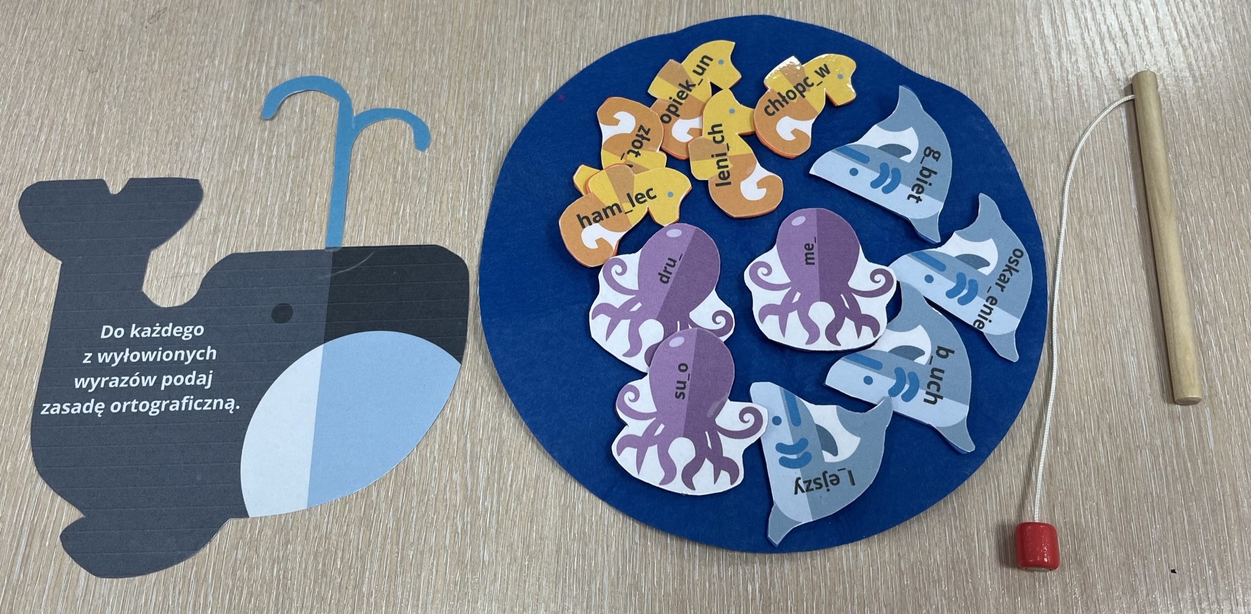 Na zwierzątkach morskich wypisałam wyrazy z luką z powyższymi trudnościami ortograficznymi. Zadaniem ucznia jest wylosować ośmiornicę, konika morskiego lub rekina i powiedzieć, jak poprawnie zapisać wyraz oraz podać zasadę ortograficzną.