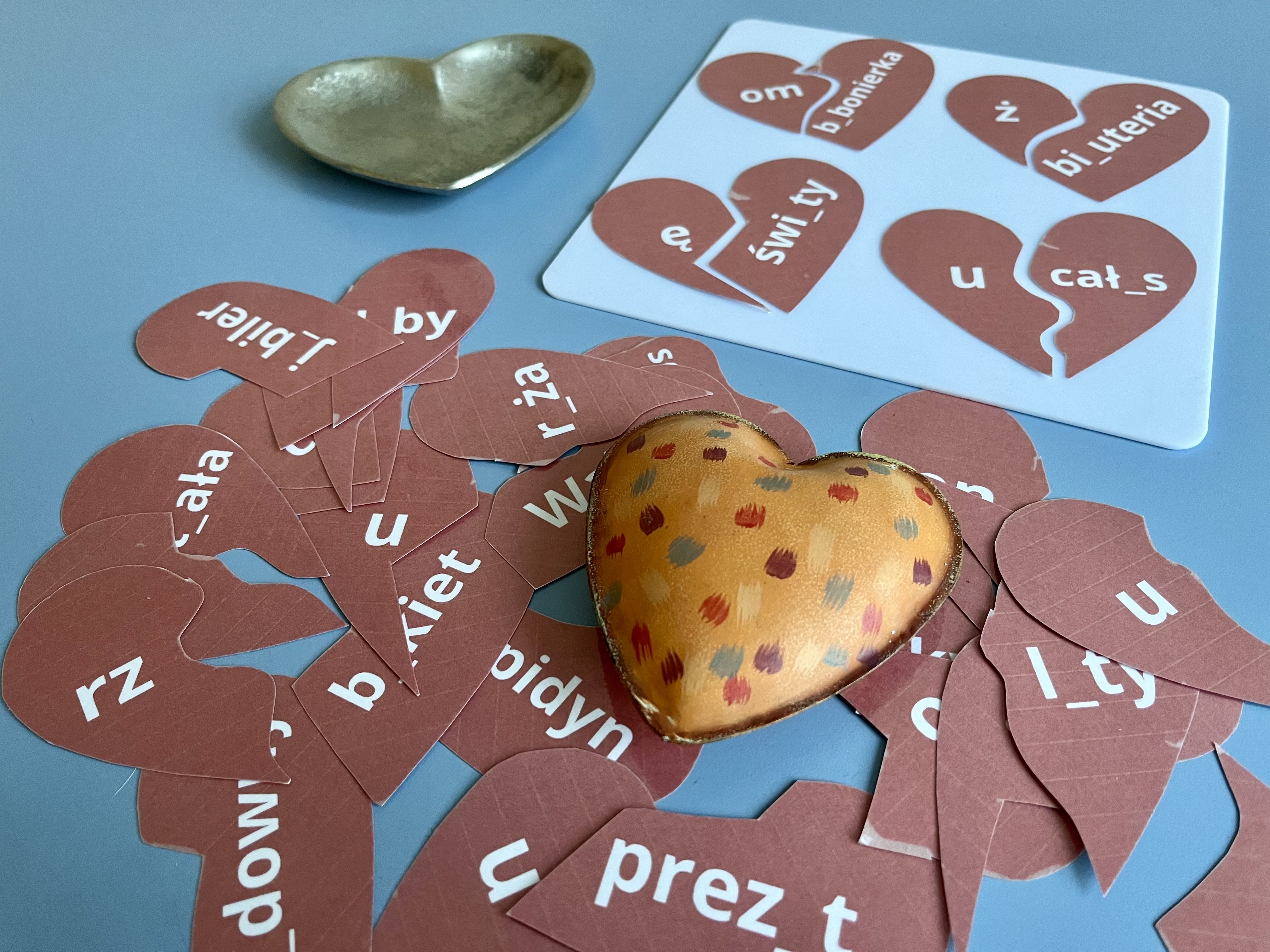 2. Zadaniem ucznia jest ułożyć puzzle - połączyć wyraz z odpowiednią trudnością ortograficzną. Wyrazy są tak pocięte, by dwie połówki serca pasowały do siebie.