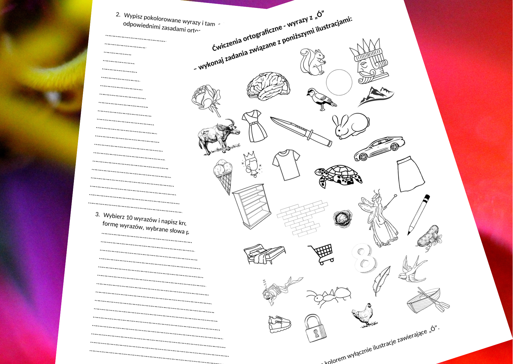 Karta pracy zawierająca ilustracje  oraz trzy zadania ortograficzno-redakcyjne dotyczące wyrazów z "ó". Karta jest w formacie doc, więc istnieje możliwość edycji i zmian.