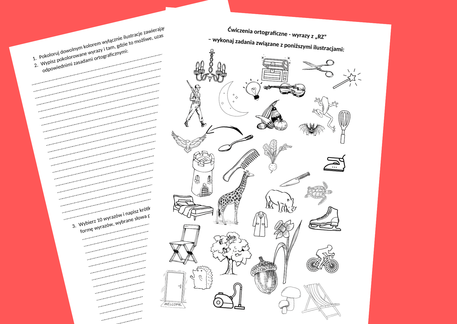 Karta pracy zawierająca ilustracje  oraz trzy zadania ortograficzno-redakcyjne dotyczące wyrazów z "rz". Karta jest w formacie doc, więc istnieje możliwość edycji i zmian.