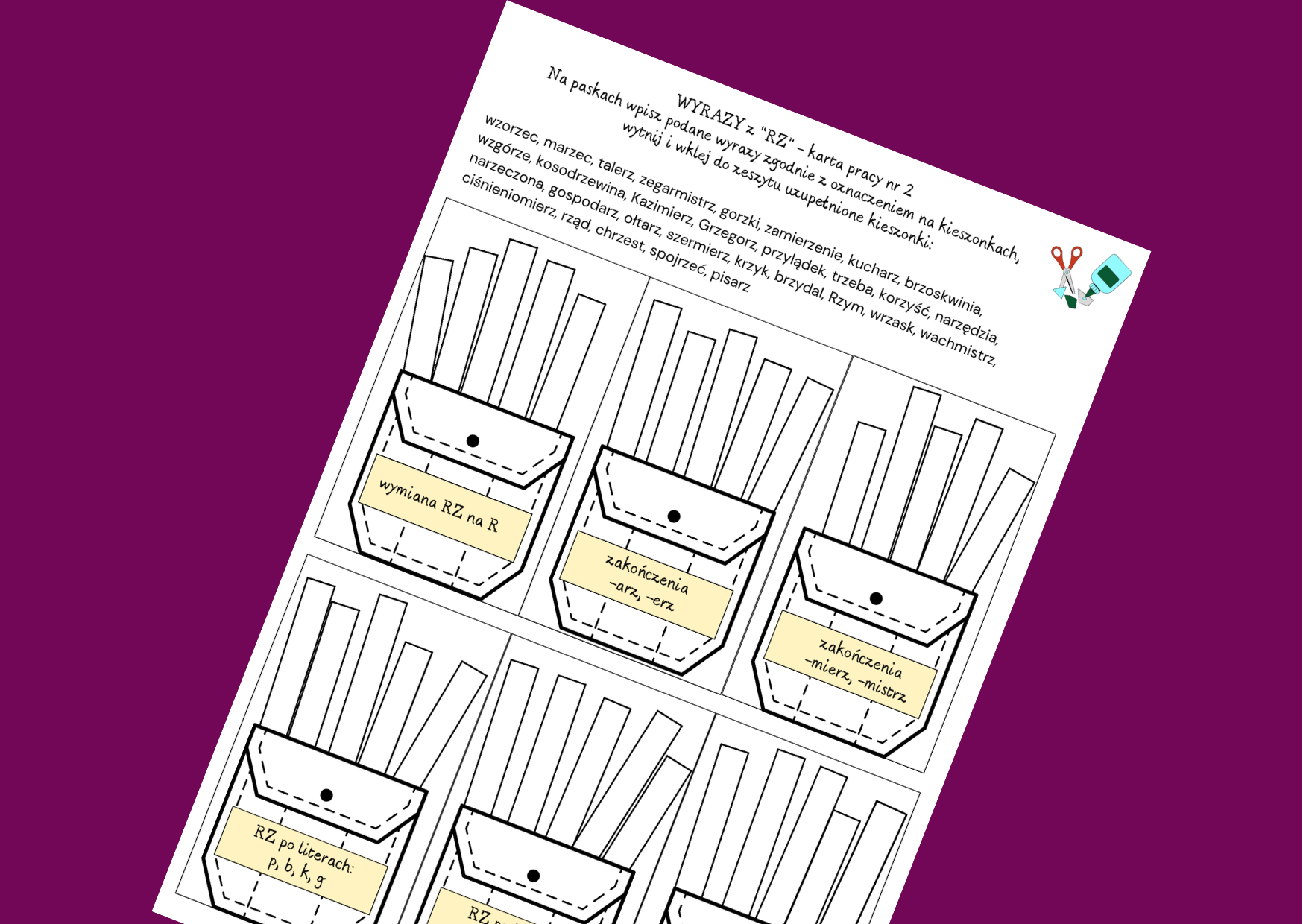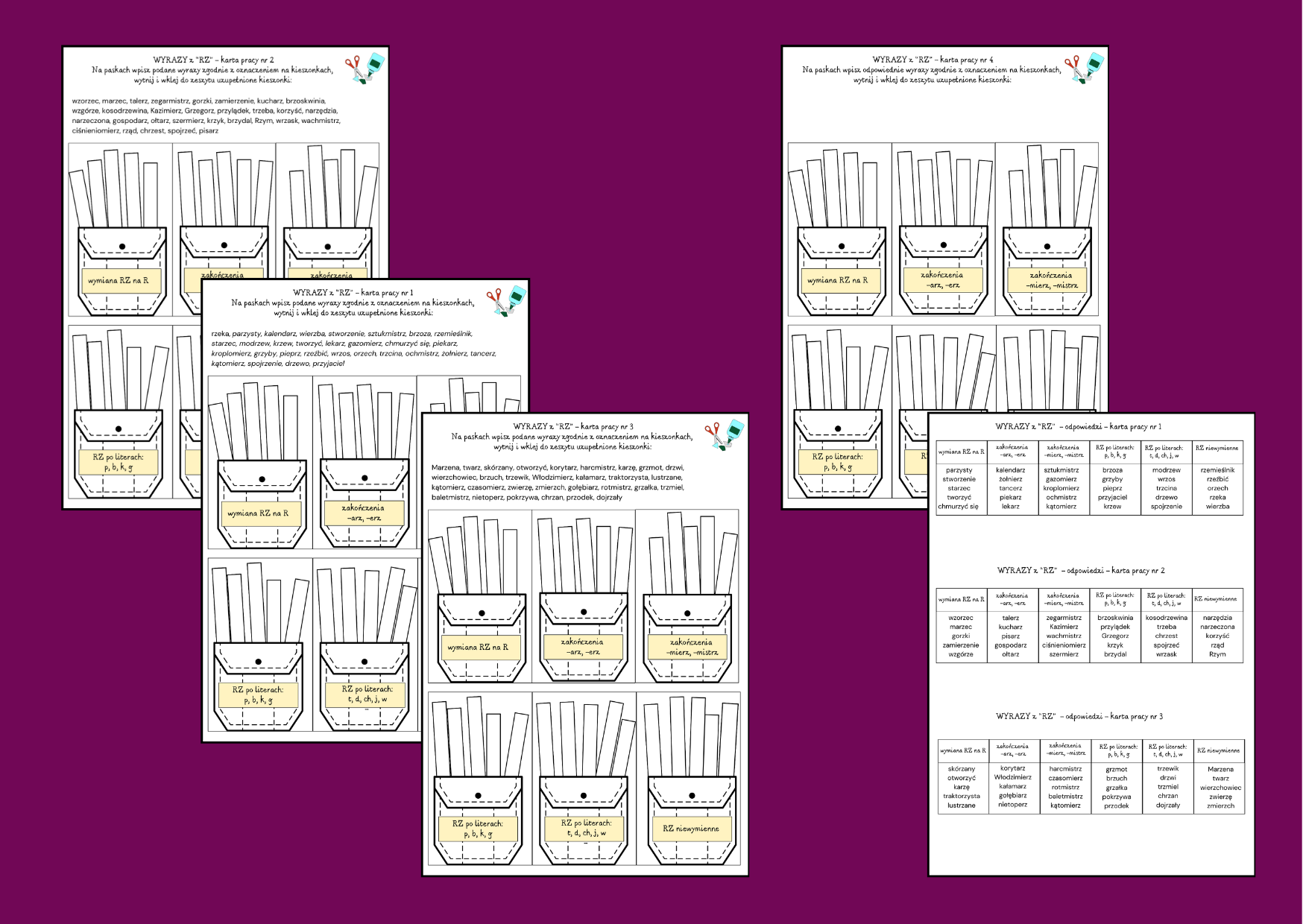 Zestaw kart pracy dotyczących ortografii: 3 karty pracy do uzupełnienia przez uczniów + 1 pusta – do dowolnego uzupełnienia (przez ucznia lub nauczyciela). Na każdej karcie pracy znajduje się po 6 kieszonek z zasadami ortograficznymi. Zadaniem uczniów jest dopasowanie podanych wyrazów do określonej zasady ortograficznej – wpisanie ich na „kieszonkach”, a następnie wycięciu i wklejeniu do zeszytu poszczególnych „kieszonek”. Można też pracować na karcie bez wycinania i wklejania. Dołączyłam odpowiedzi.