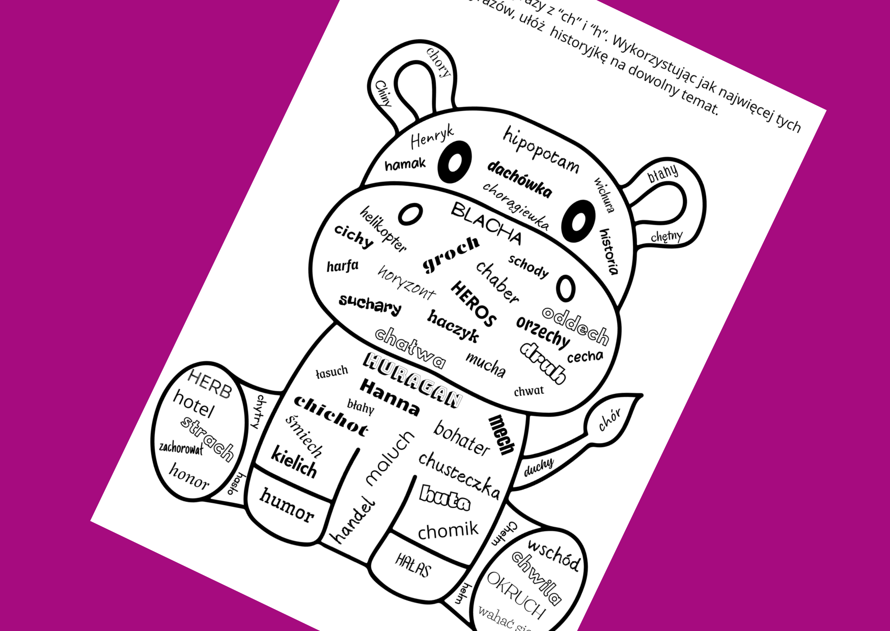 Karta pracy z chmurą wyrazową w kształcie hipopotama, w której umieściłam wyrazy z "ch" i "h". Zadanie uczniów polega na wypisaniu (np. w tabelce) wyrazów, a następnie zredagowaniu opowiadania z wykorzystaniem odnalezionych wyrazów.