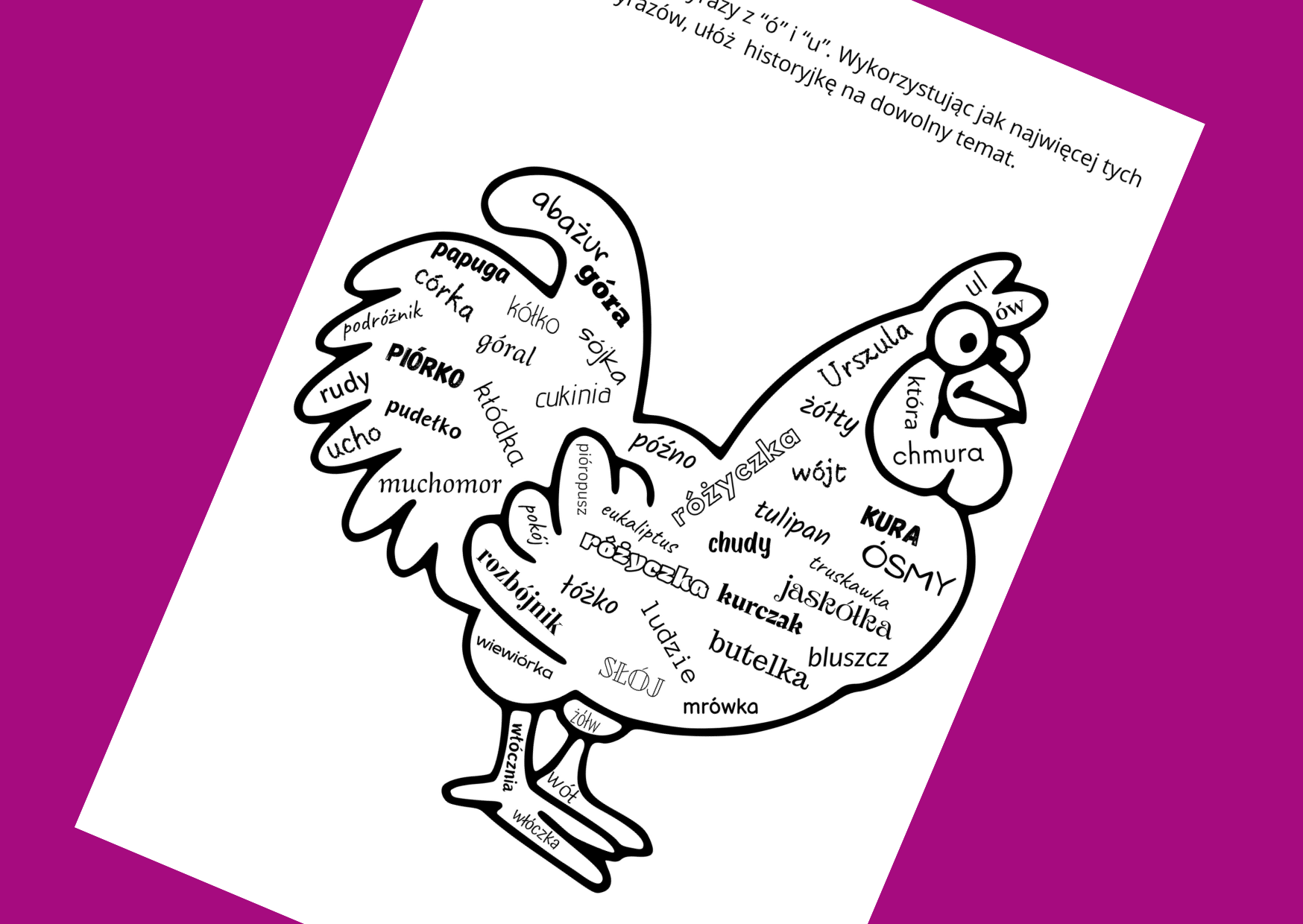 Karta pracy z chmurą wyrazową w kształcie koguta, w której umieściłam wyrazy z "ó" i "u". Zadanie uczniów polega na wypisaniu (np. w tabelce) wyrazów, a następnie zredagowaniu opowiadania z wykorzystaniem odnalezionych wyrazów.