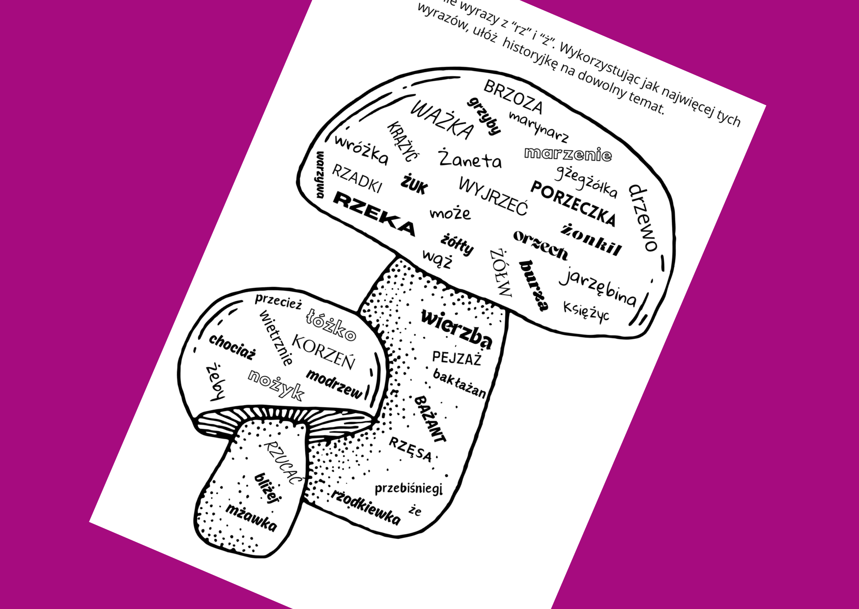 Karta pracy z chmurą wyrazową w kształcie grzybów, w której umieściłam wyrazy z "rz" i "ż". Zadanie uczniów polega na wypisaniu (np. w tabelce) wyrazów, a następnie zredagowaniu opowiadania z wykorzystaniem odnalezionych wyrazów.
