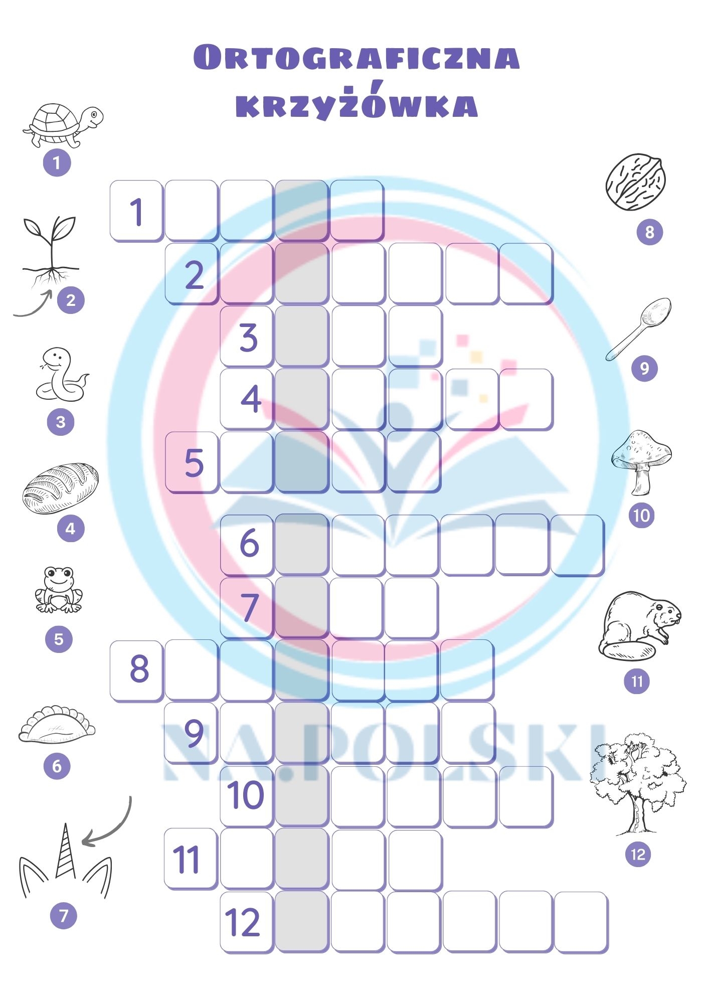 Ortograficzna krzyżówka. Wpisz nazwy przedmiotów, zwierząt lub roślin w oznaczone miejsca.