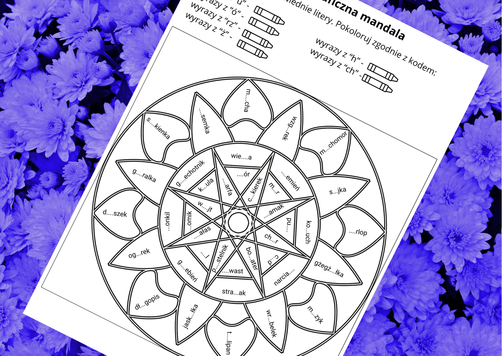 Mandala z wyrazami z "ó', "u", "rz", "ż", "ch", "h". Zadanie polega na pokolorowaniu mandali zgodnie z instrukcją. Potem wyrazy można wykorzystać do różnych ćwiczeń ortograficznych czy redakcyjnych. Do pracy można wykorzystać słowniki ortograficzne - szczególnie w młodszych klasach.