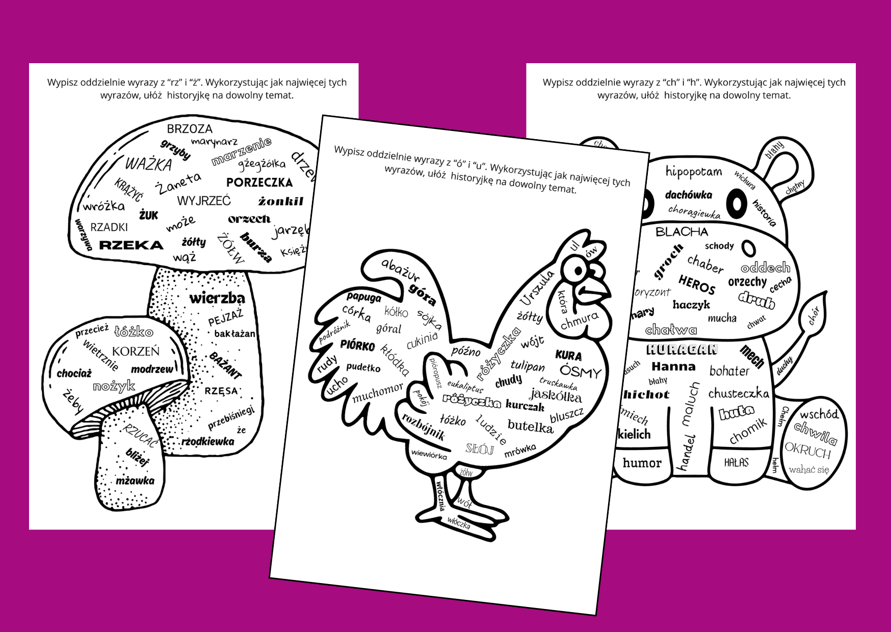 Zestaw 3 kart pracy z chmurami wyrazowymi, w których umieściłam wyrazy z "ch" i "h", "ó" i "u" oraz "rz" i "ż". Zadanie uczniów polega na wypisaniu (np. w tabelce) wyrazów, a następnie zredagowaniu opowiadania z wykorzystaniem odnalezionych wyrazów.