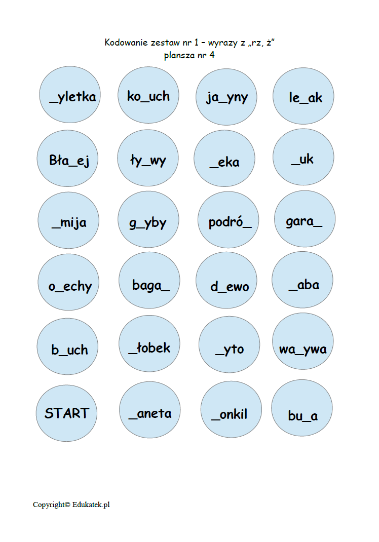 Gra ortograficzna, podczas której dzieci doskonalą poprawność ortograficzną w zakresie ó, u, ż, rz, h, ch. Pakiet zawiera 3 zestawy plansz z tabliczką mnożenia (każdy zestaw liczy 6 stron). W ramach każdego zestawu są 4 plansze zawierające różne kombinacje wyrazów oraz 2 plansze, które można wykorzystać kontrolnie lub np. do memory.