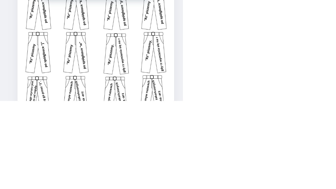 z uczniami do punktu 3 (patrz instrukcja poniżej) lub na tym etapie sprawdzić czy uczniowie prawidłowo przyporządkowali pranie: wybrany uczeń odczytuje napis na koszulce np. z pralki „rz” i próbuje uzasadnić pisownię wyrazu (klasa i nauczyciel koryguje wybór ucznia w razie potrzeby).