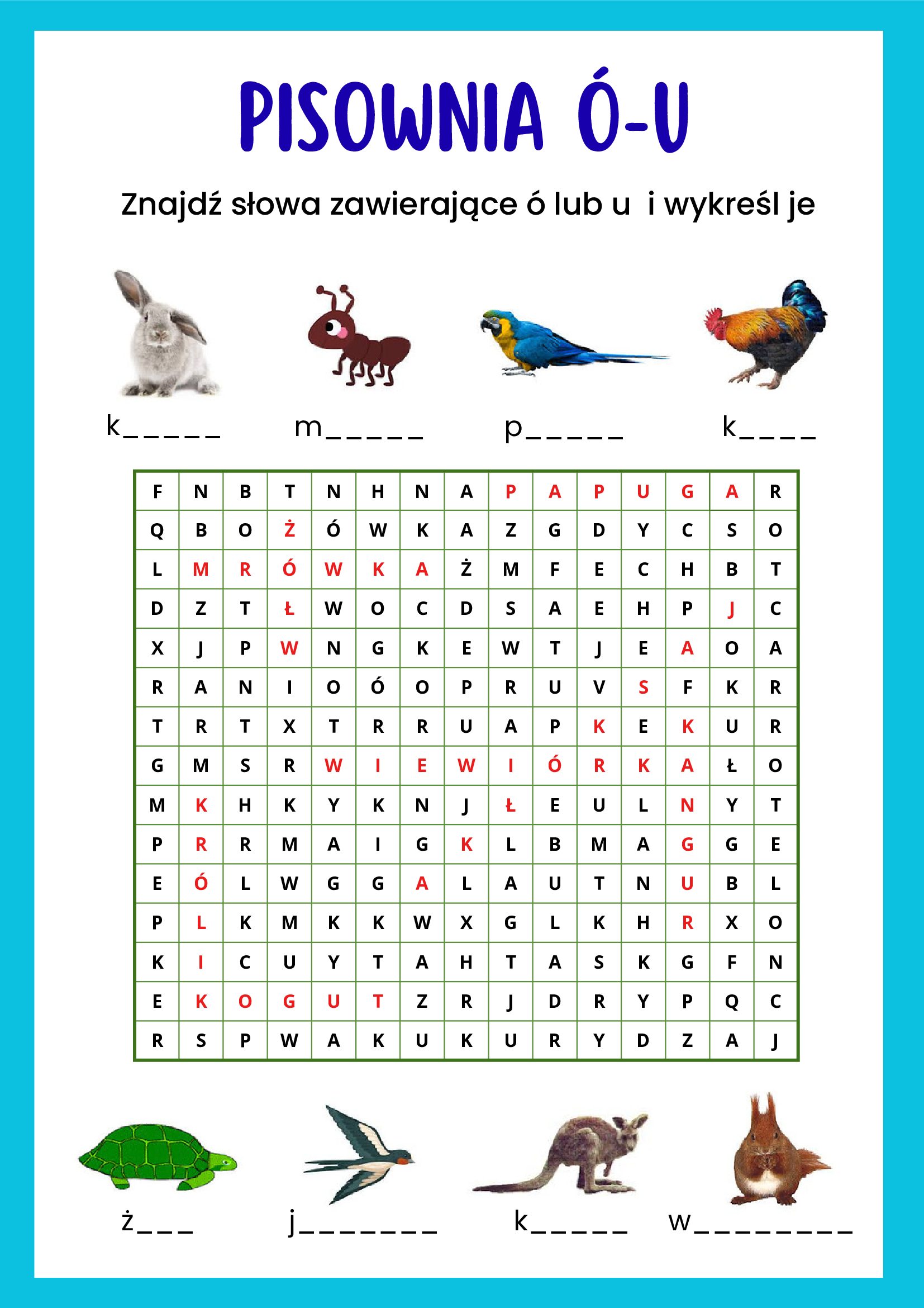Zestaw 3 wykreślanek sprawdzające znajomość pisowni ó, u. Wykreślanki podzielone są na trzy kategorie: zwierzęta, warzywa - owoce, przedmioty. Uczniom można rozdać wykreślanki, gdy zostaje trochę czasu na lekcji. Można również podzielić uczniów na grupy i zrobić konkurs klasowy, która grupa szybciej odnajdzie 8 słów na kolejnych wykreślankach. Do materiału dołączone zostały odpowiedzi.