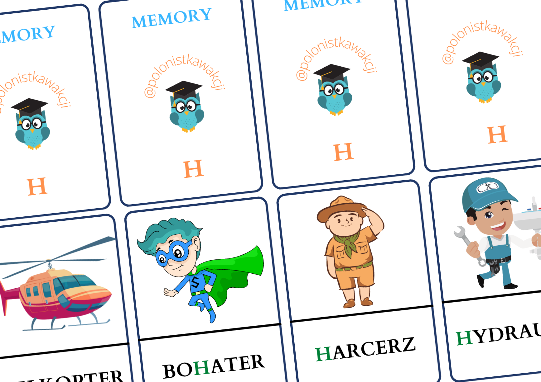 Zestaw zawiera 10 stron. Na jednej awers i rewers 4 kart z ilustracją oraz wyrazem. Karty należy wydrukować dwukrotnie. Piotrusiem jest sama litera H. Gdy się ją odłoży, uzyskuje się grę typu memory.