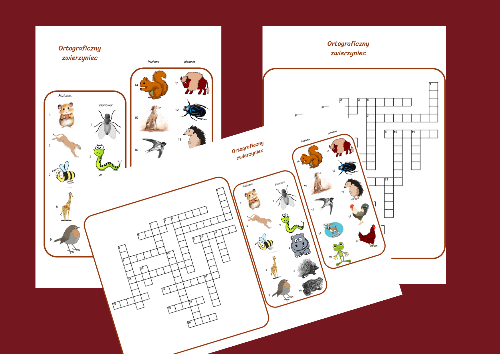 Krzyżówka obrazkowa dotycząca wyrazów z trudnością ortograficzną nazywających zwierzęta. Po rozwiązaniu wpisane słowa można wykorzystać np. do ćwiczeń ortograficznych lub redakcyjnych.