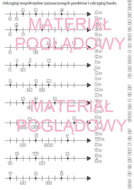 Materiał zawiera notatkę z lekcji o osi liczbowej oraz kodowaną kartę pracy. Przeznaczone na pierwsze lekcje o osi w klasie 4 lub 5, a także jako przypomnienie w starszych klasach.