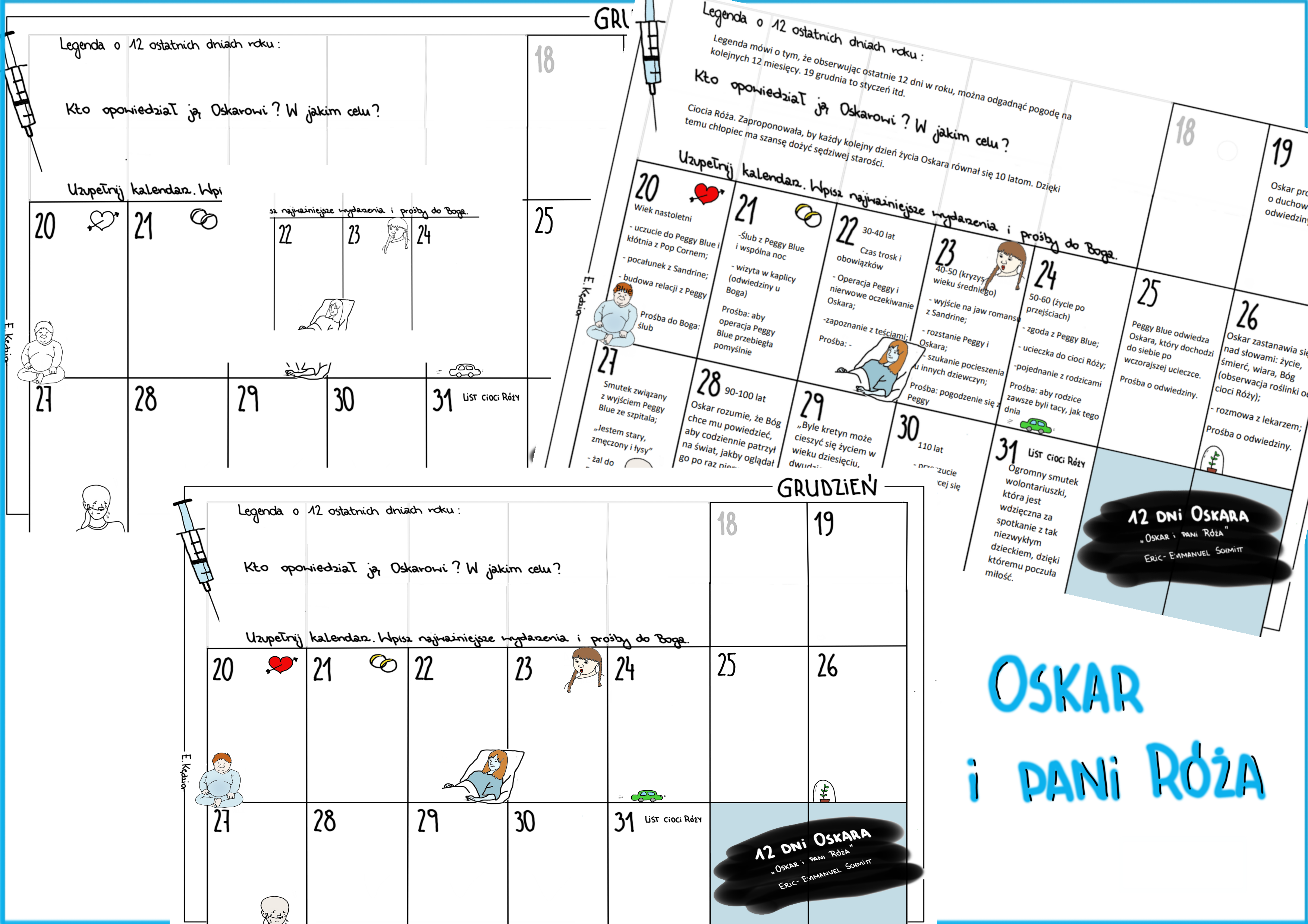 W zestawie znajdują się dwie karty w trzech wersjach (pusta, kolorowa i w przykładowy sposób wypełniona): 1. 12 dni z życia Oskara - kalendarz. 2. Mali pacjenci - bohaterowie.
