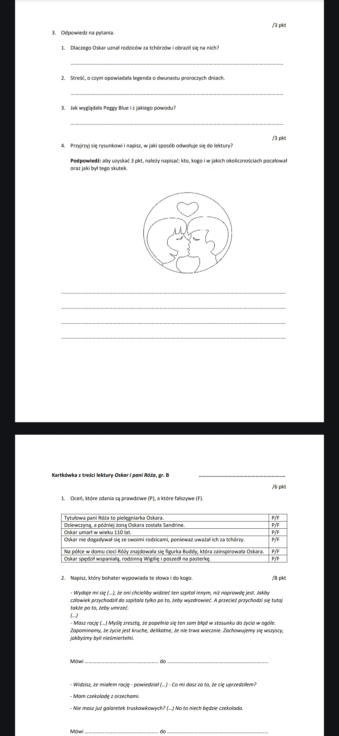 Kartkówka z treści lektury uzupełniającej "Oskar i pani Róża" Erica-Emmanuela Schmitt'a.