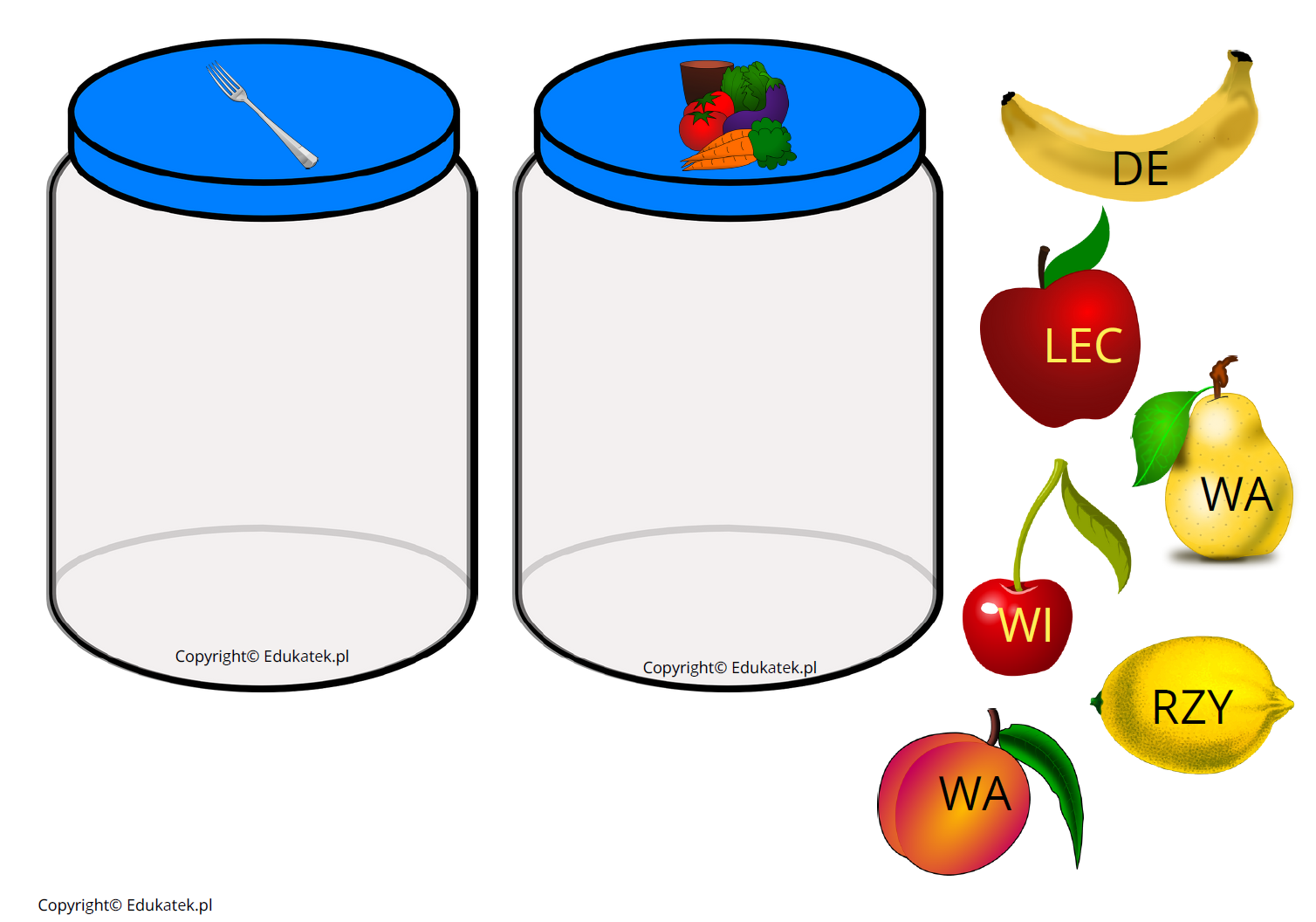 W skład zestawu wchodzi 45 stron do samodzielnego wydrukowania ( 90 słoików oraz owoce z sylabami). Nauczyciel, rodzic decyduje o ilości kart w grze oraz o trudności zadania. Dla dzieci słabo czytających polecam zabawę z krótszymi wyrazami.
