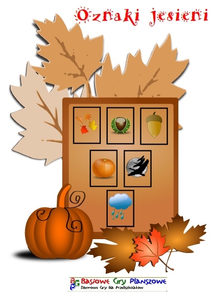 Oznaki jesieni to gra planszowa utrwalająca u dzieci 6 oznak jesieni (kolorowy liść, kasztan, żołądź, dynia, odlatujące ptaki, deszcz). Celem jest odnajdywanie na planszy symboli wylosowanych na kostce. Na koniec gracze porównują jak dużo symboli udało im się odnaleźć jako pierwszych.