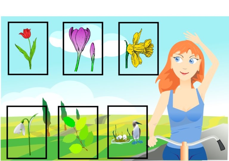 Oznaki wiosny to gra planszowa utrwalająca u dzieci 6 oznak wiosny (tulipan, krokus, żonkil, pierwiosnek, zielone liście, ptasie jaja). Celem jest odnajdywanie na planszy symboli wylosowanych na kostce. Na koniec gracze porównują jak dużo symboli udało im się odnaleźć jako pierwszych.