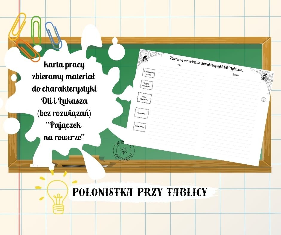 Materiał zawiera kartę pracy -> miejsce do uzupełnienia informacjami, które posłużą uczniom do zredagowania charakterystyki głównych bohaterów powieści E. Nowak „Pajączek na rowerze” (strona formatu A4) bez rozwiązań. Karta będzie wygodnym sposobem na urozmaicenie lekcji i uporządkowanie informacji.