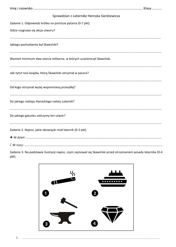 Materiał zawiera 11 sprawdzianów do lektur obowiązkowych z klas 7-8 razem z kluczem odpowiedzi do zadań.